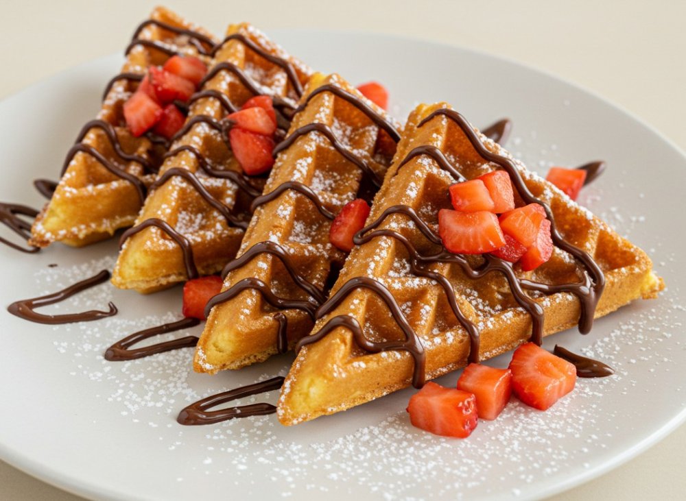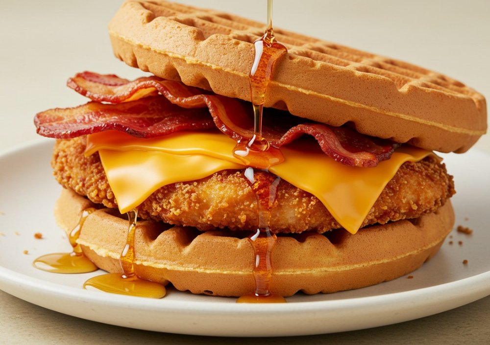 Waffle con pollo panko, queso cheddar, tocino y syrup.