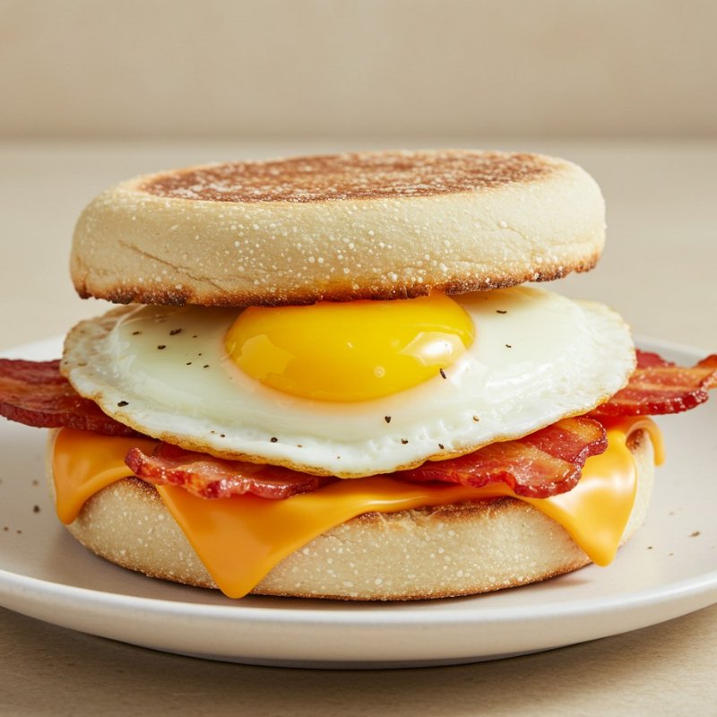 Sandwich en pan tipo muffin inglés (salado) con huevo frito, Tocino y queso cheddar.