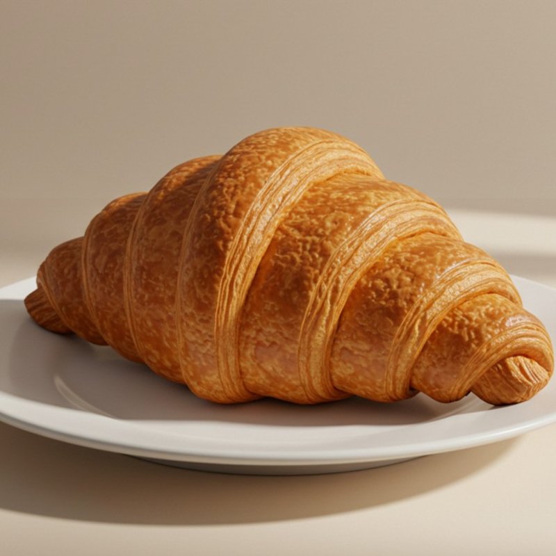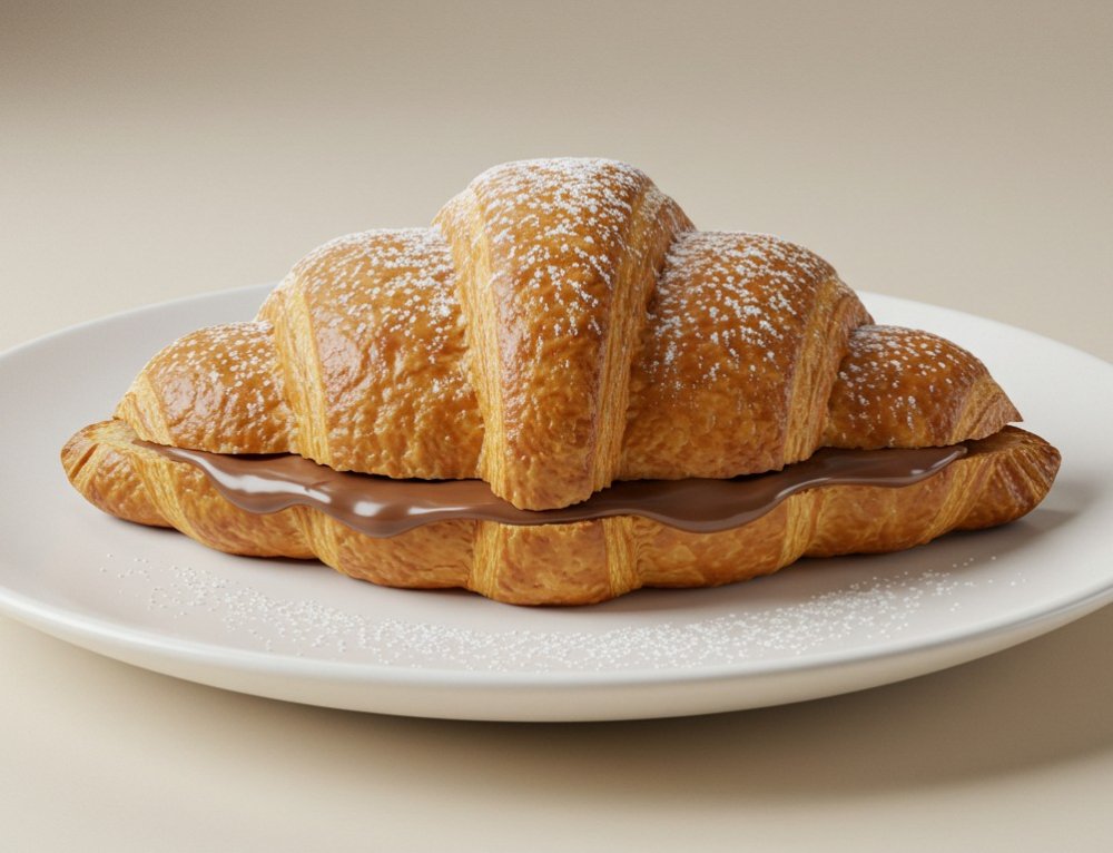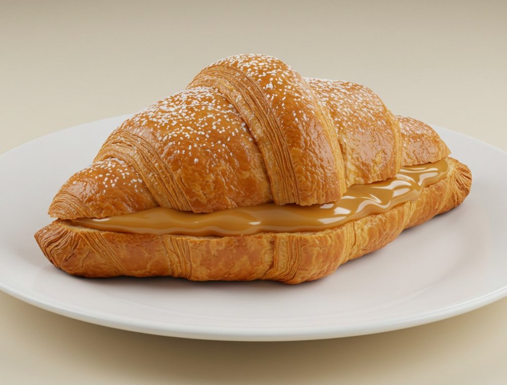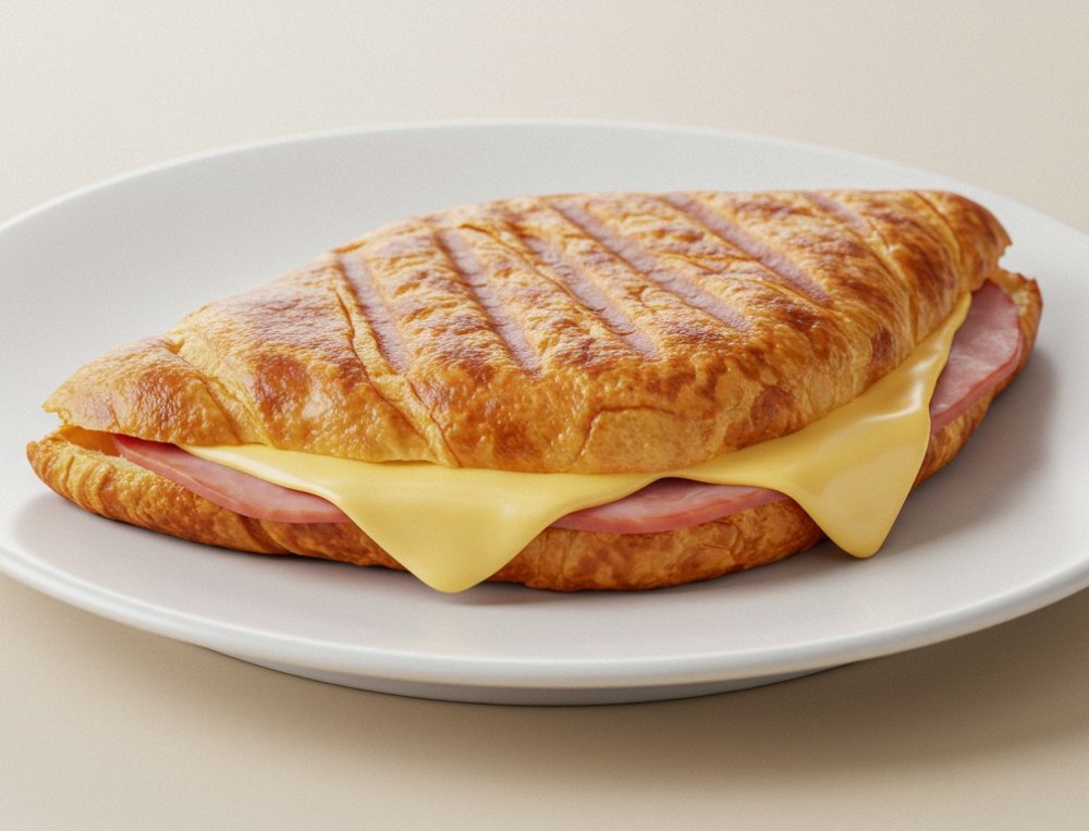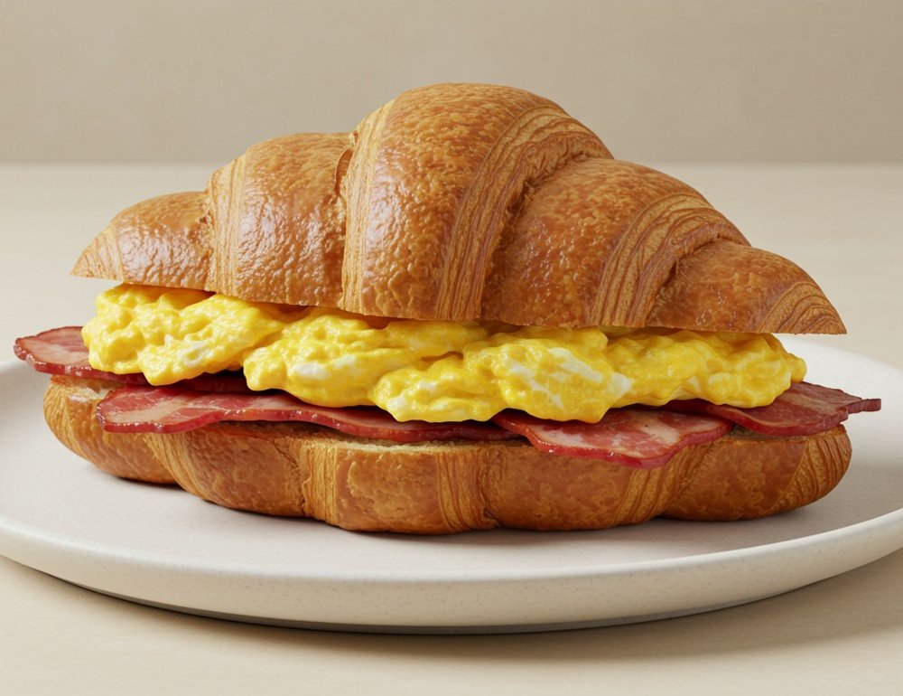 Croissant con huevo revuelto, queso y jamón de cerdo.