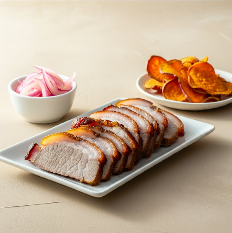 Medio kilo de chicharrón de cerdo con chips de camote, zarza criolla y salsas a elección.