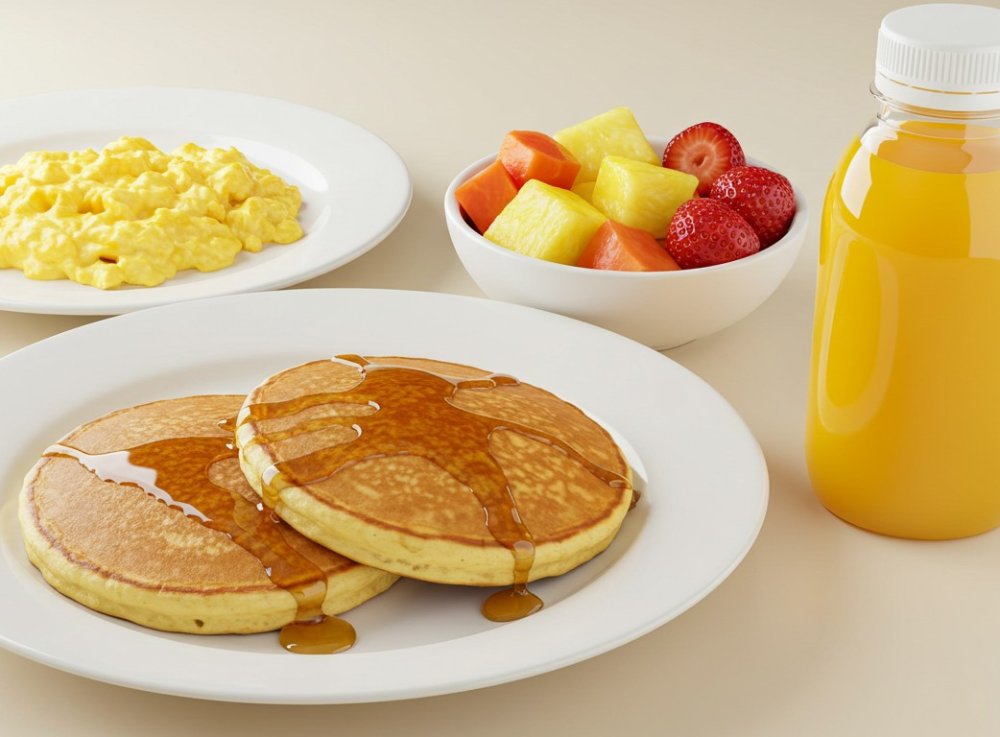 Incluye pancakes y bebida a elección, huevos revueltos y porción de fruta