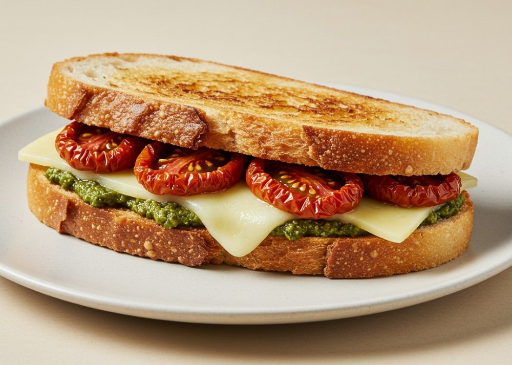 Sandwich en pan campesino con queso mozzarella, tomate confitado y pesto.