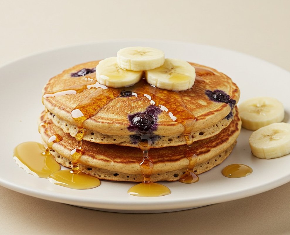 Pancakes de harina de trigo con relleno de arándanos, tajadas de plátano y syrup.