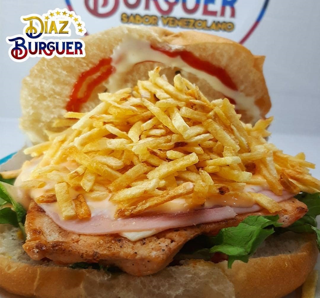 Carne o pollo, jamón, queso, lechuga, tomate, cebolla, ensalada de col y papas al hilo.