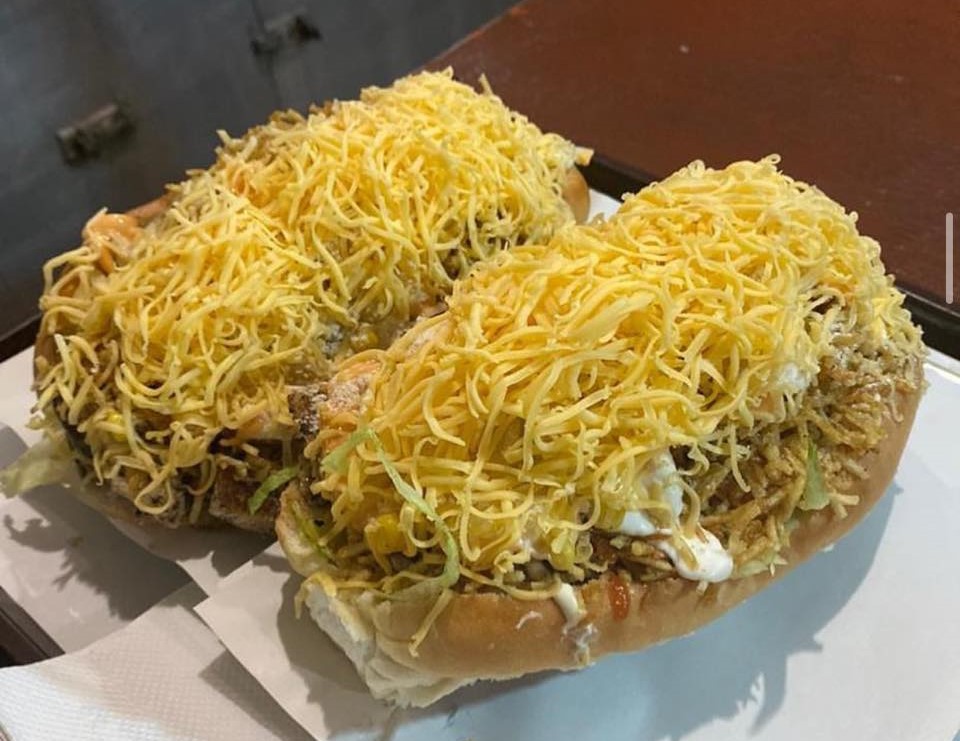 Hot dog, jamón, queso amarillo, cebolla, ensalada de col y papas al hilo.