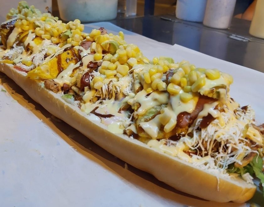 Carne, pollo, chorizo, jamón, queso amarillo, huevo, doble tocineta, maíz dulce, aguacate, lechuga, tomate, cebolla, ensalada de col y papas al hilo.