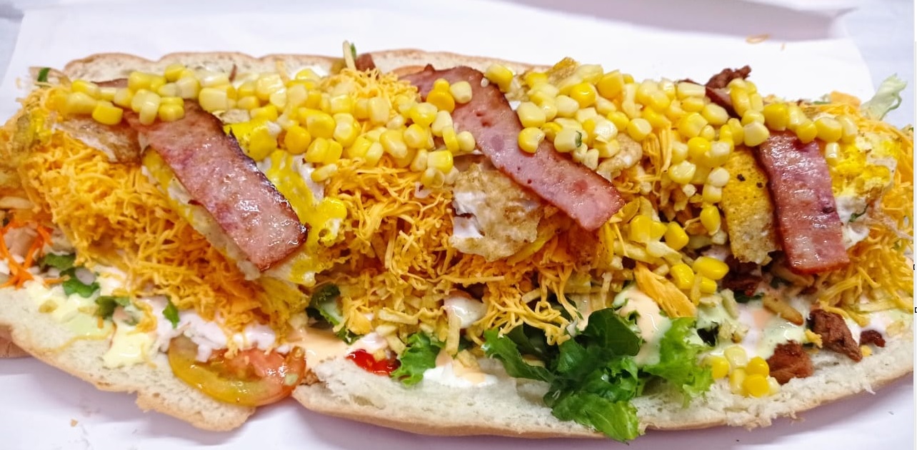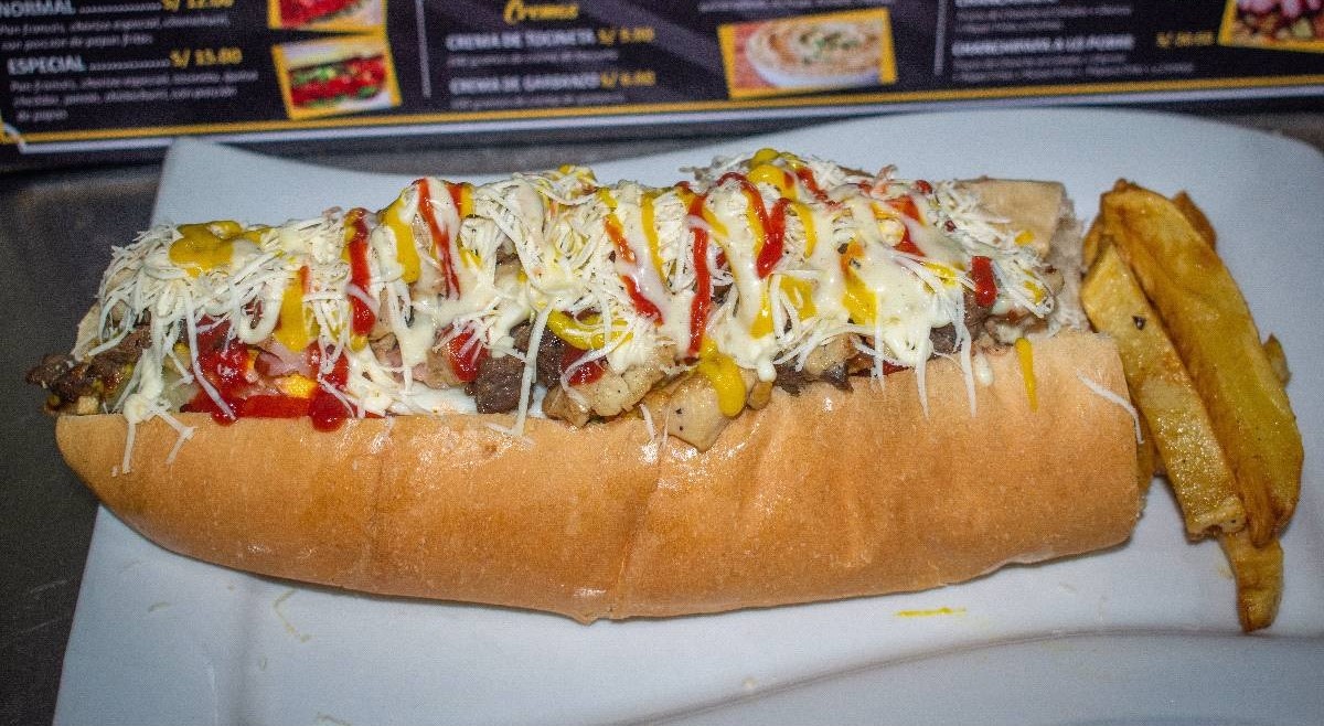 Hot dog, jamón, queso, huevo, tocineta, cebolla, ensalada de col y papas al hilo.