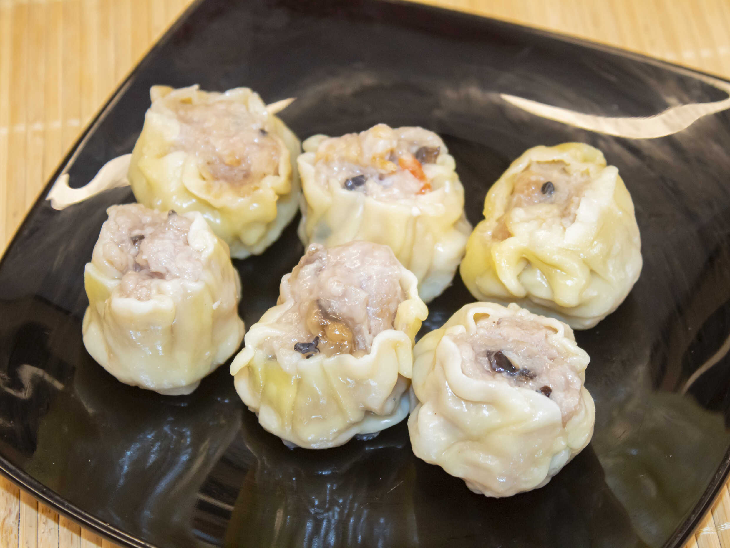 Siu mai tradicional, pasta de harina de trigo y huevo relleno con carne de cerdo al vapor.