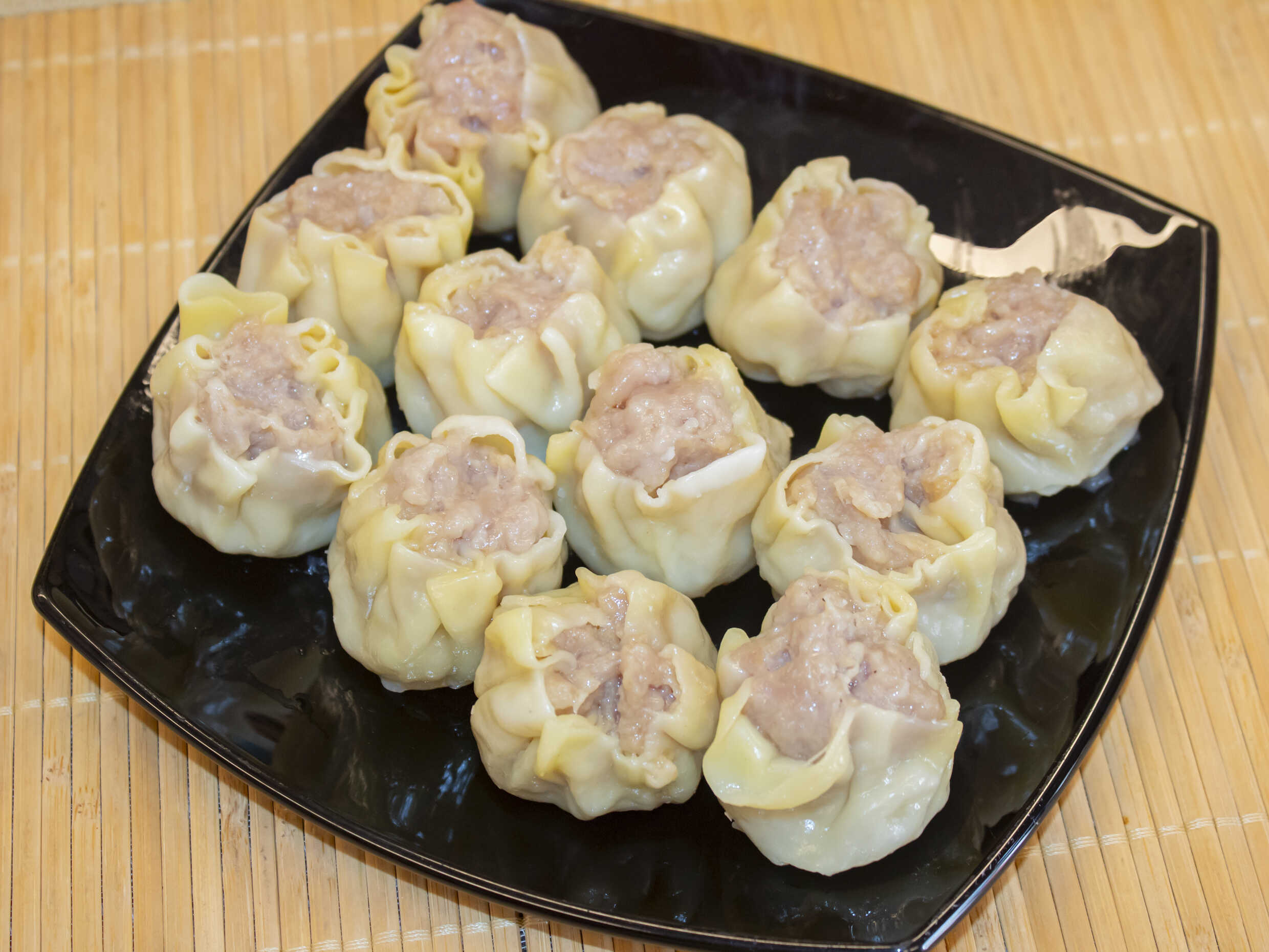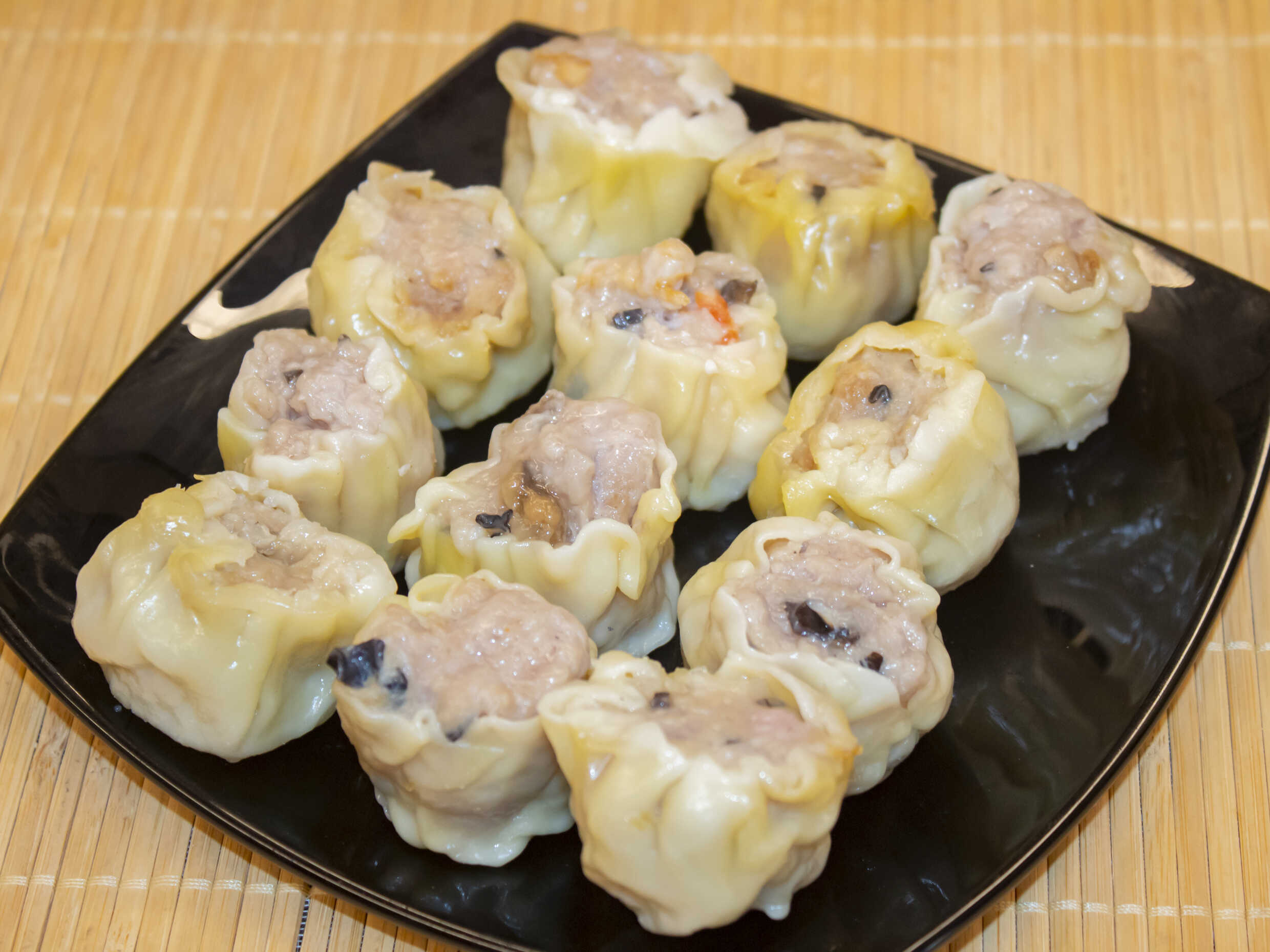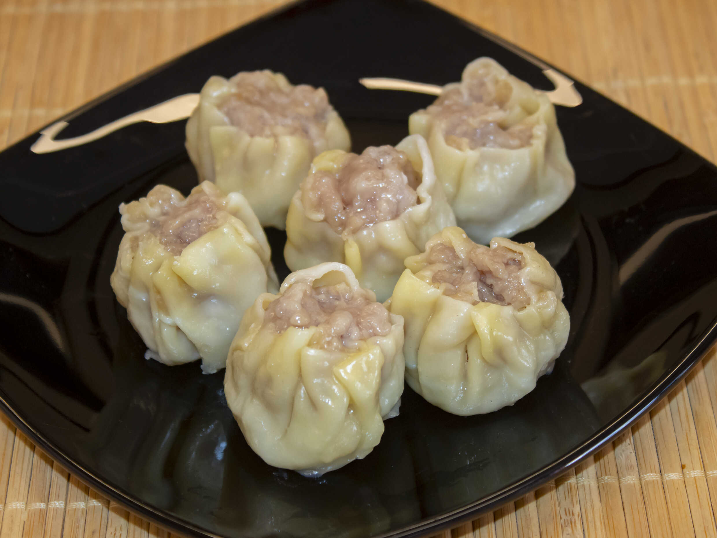 Siu mai tradicional, pasta de harina de trigo y huevo relleno con carne de cerdo al vapor.