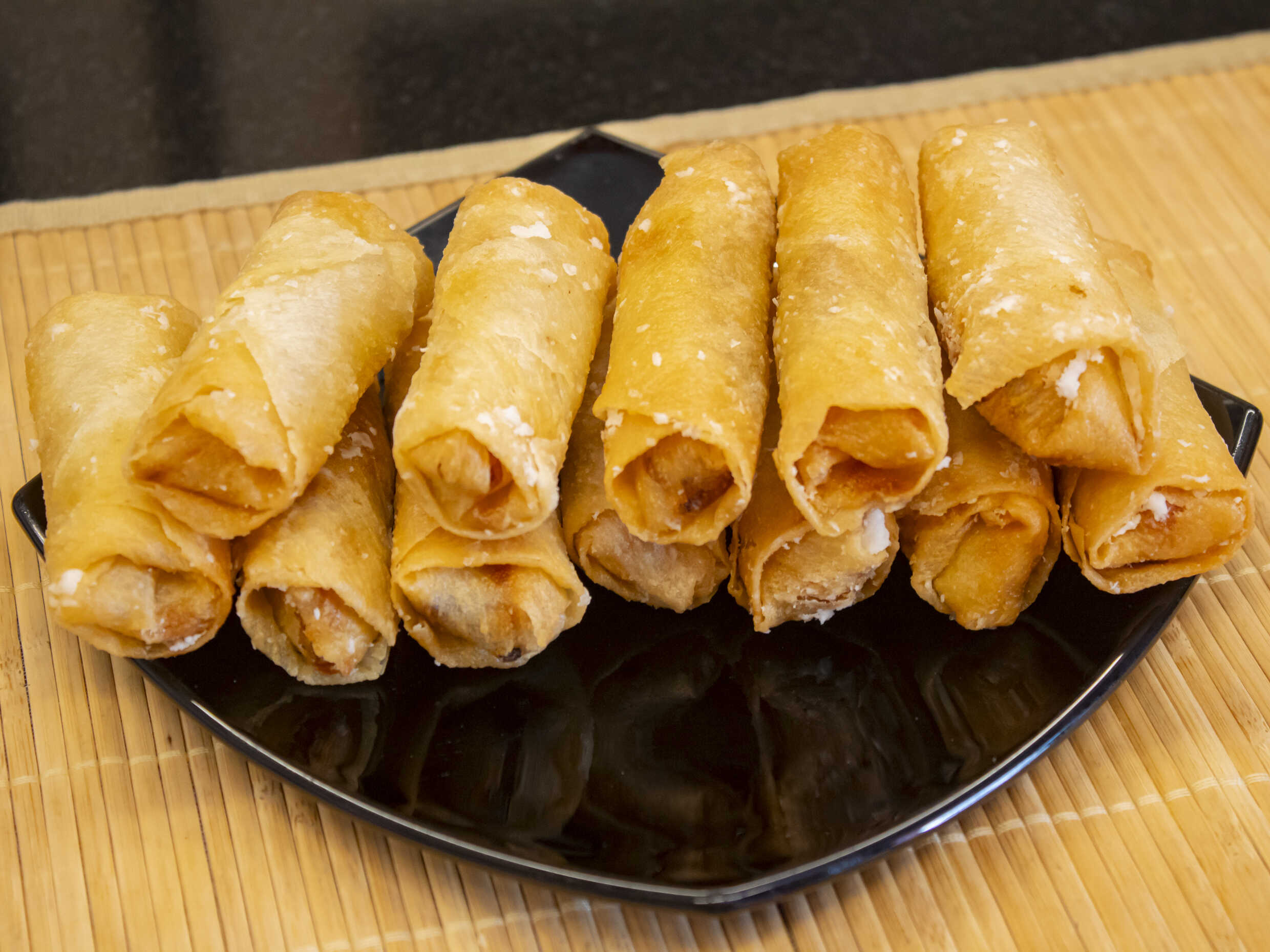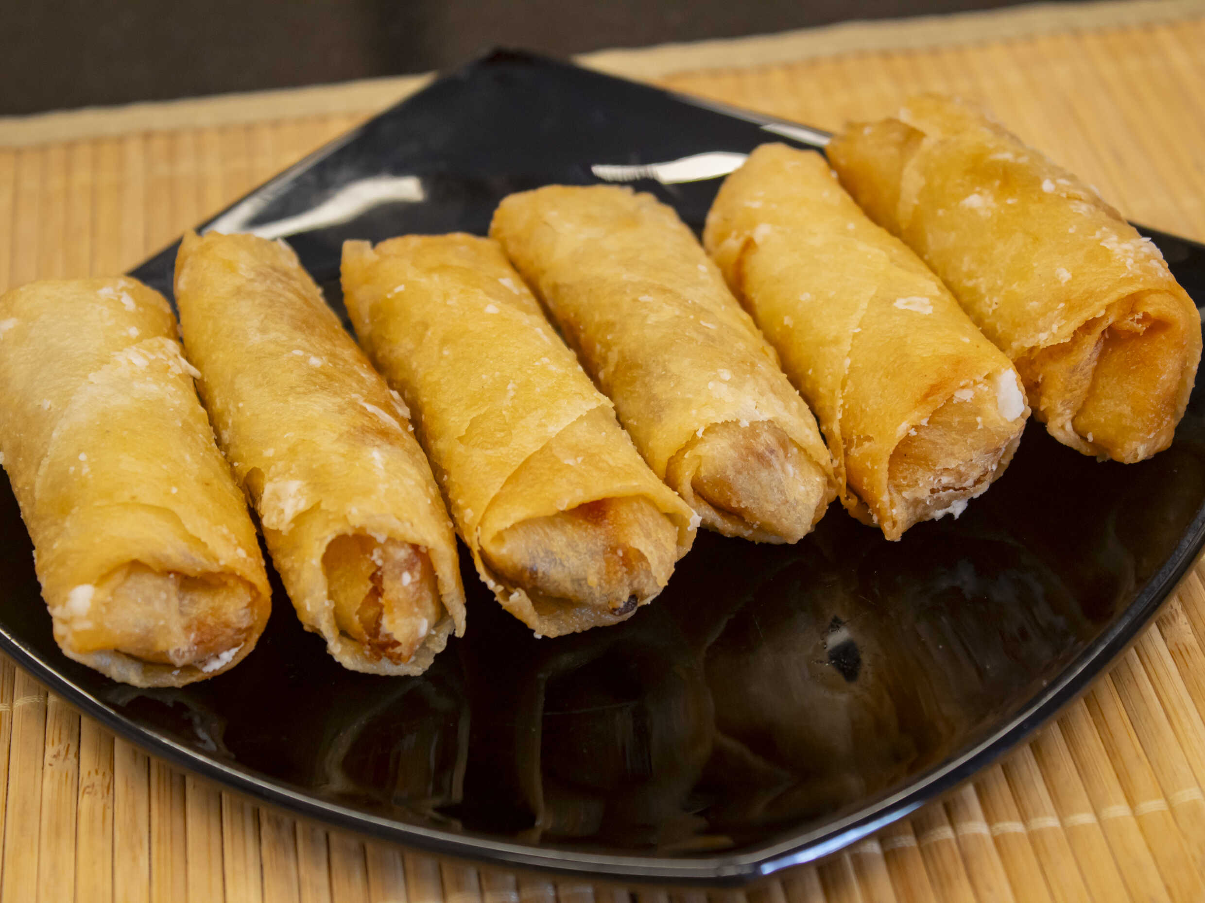 Enrollado primavera, pasta primavera relleno de zanahoria, col china y chancho asado frito.