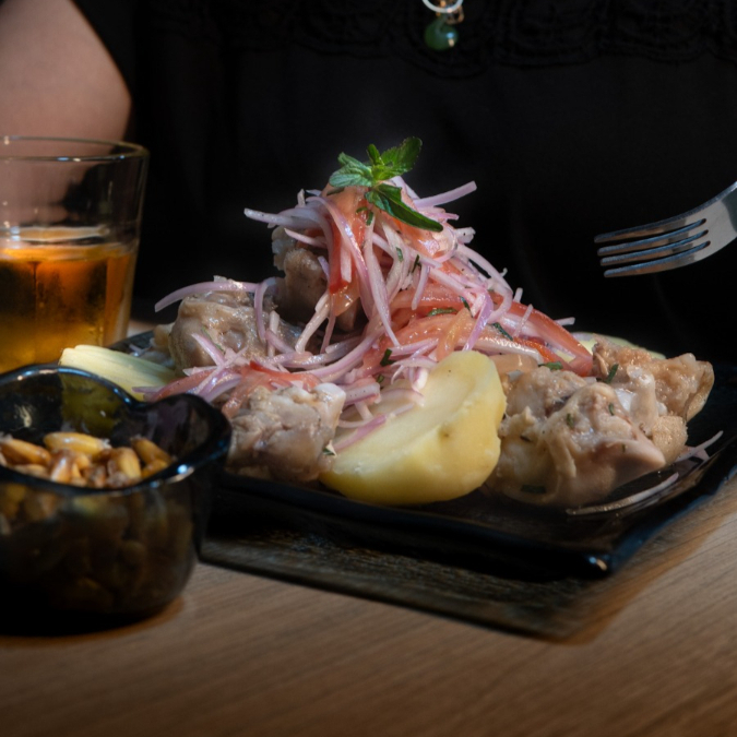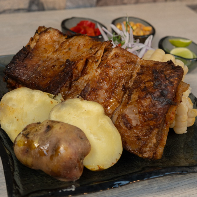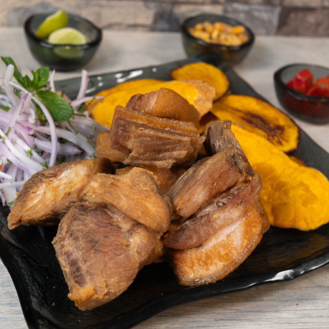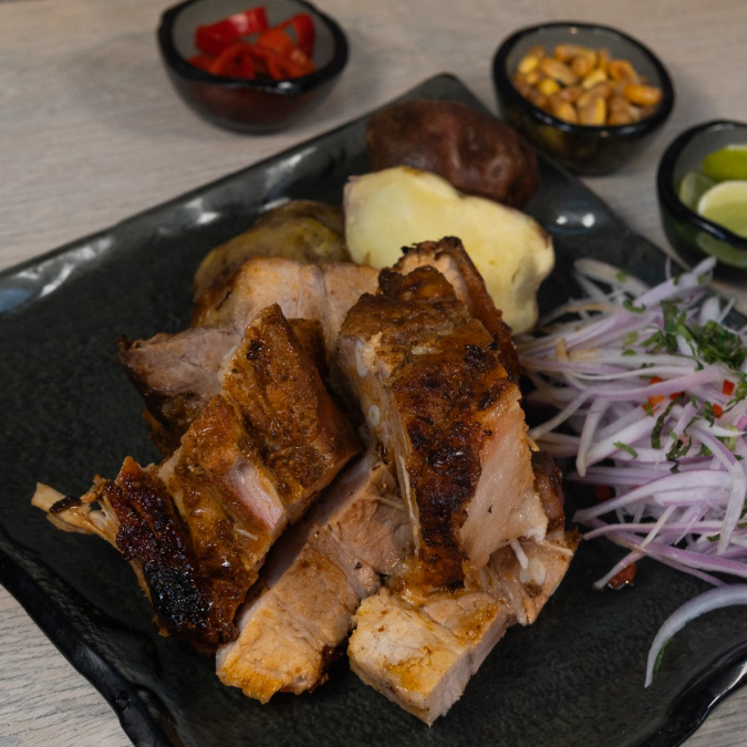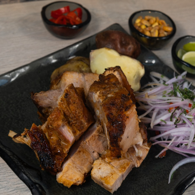 Cerdo cocido lentamente al fuego con papas doradas, mote y sarza criolla.
