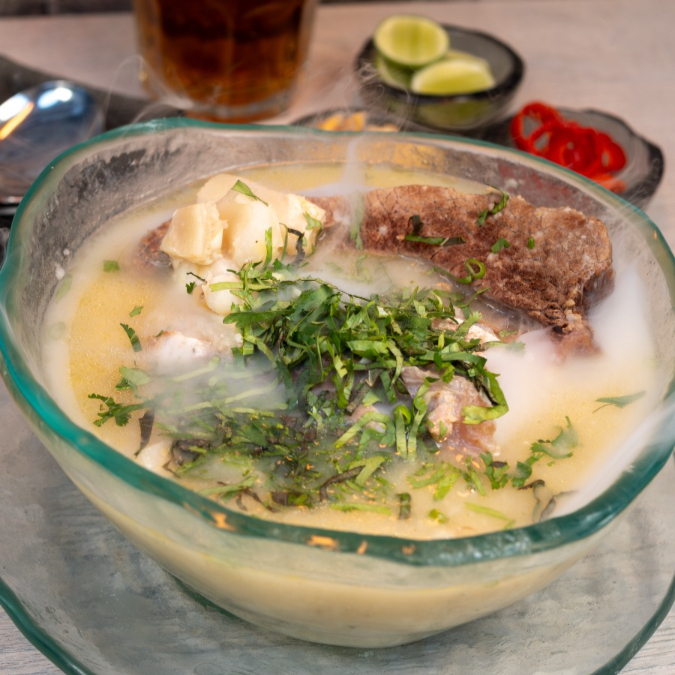 Caldo concentrado de pescado entero, cangrejo y mariscos, sabrosa y espesita.