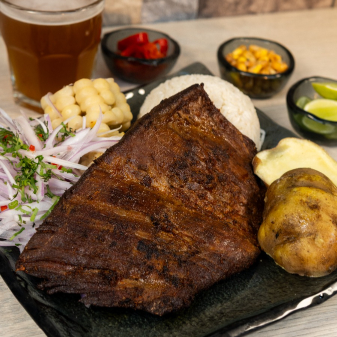 Costillar jugoso dorado lentamente a las brasas, acompañado de papas doradas y sarza criolla.