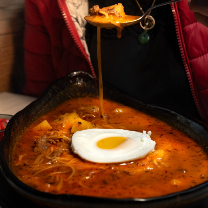 Cremoso y concentrado caldo de res, con fideos y un toque de leche.