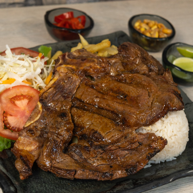 Jugoso corte de res a la parrilla con papas fritas, ensalada y arroz blanco.