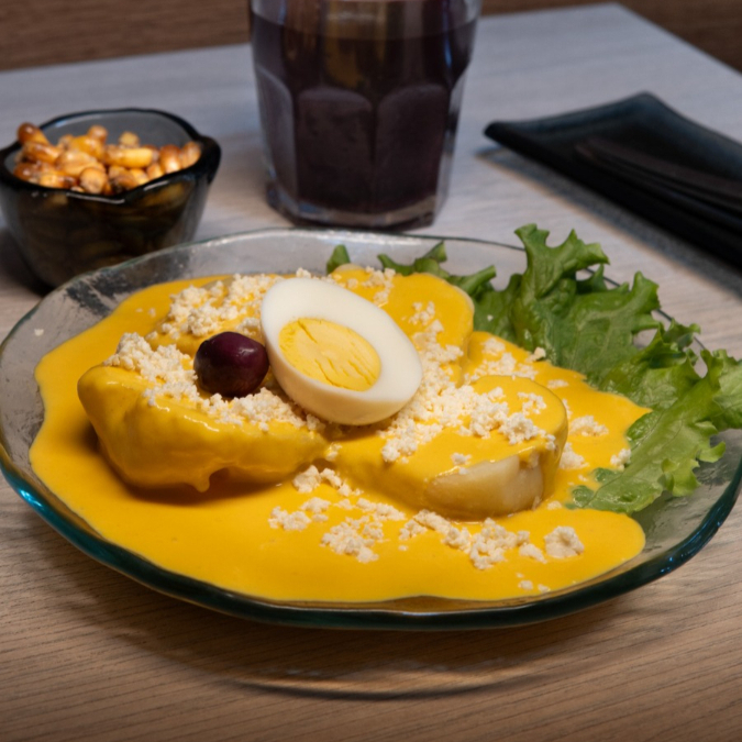 Papas huayro bañadas en cremosa salsa de ají amarillo y queso fresco.