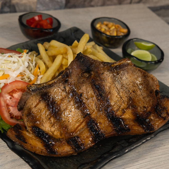 Chuleta de cerdo a la parrilla con papas fritas, ensalada y arroz blanco.