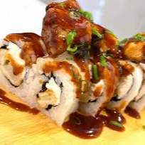 Relleno de pescado y palta, forrado con laminas de pescado, bañado con salsa spicy y flameado.