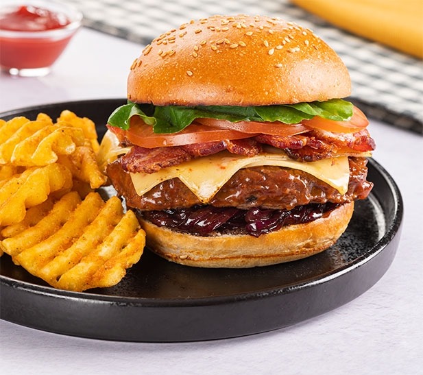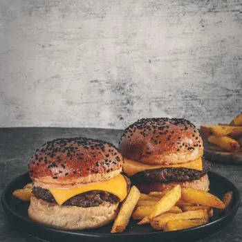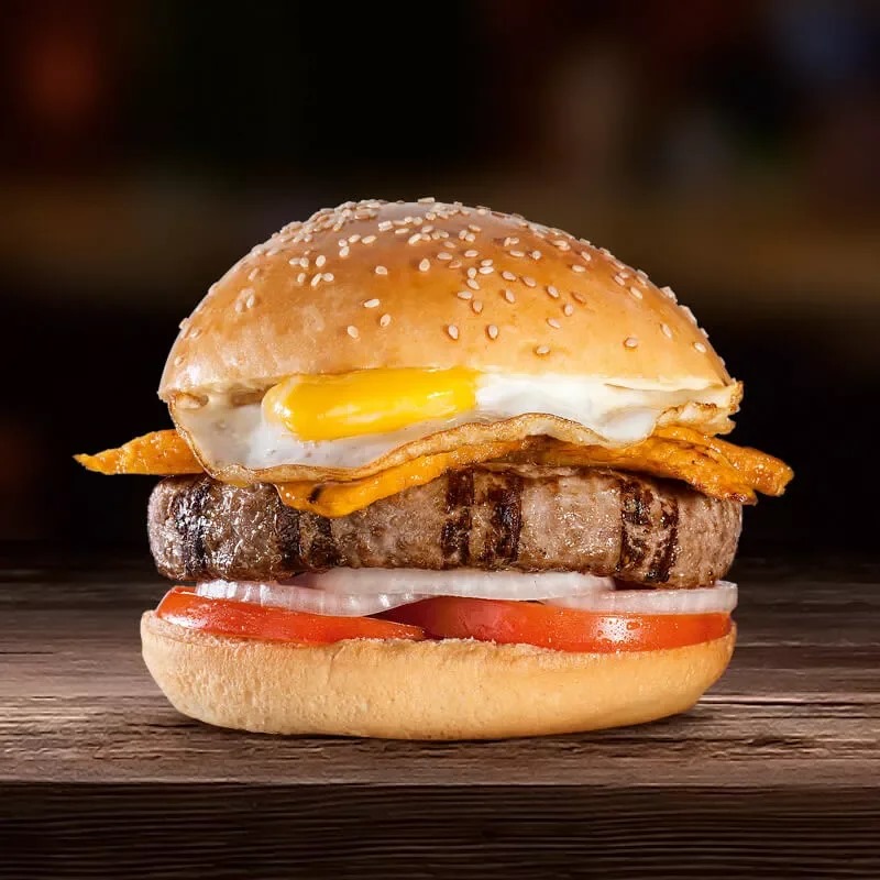 Hamburguesa 110 g de carne de res, pan Bimbo, papas al hilo y ensalada.