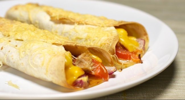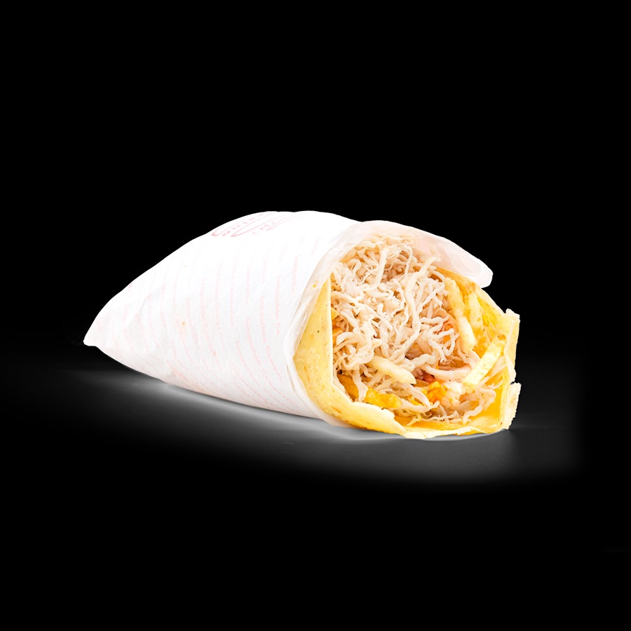 Pollo deshilachado, pan Bimbo, papas al hilo y ensalada.