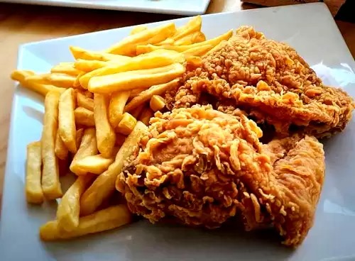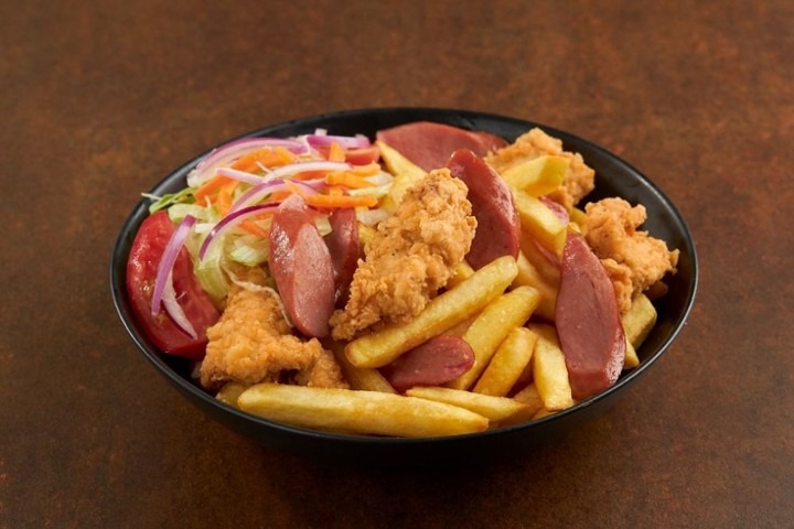 Papas, hot dog, ensalada y trozos de pollo broaster.