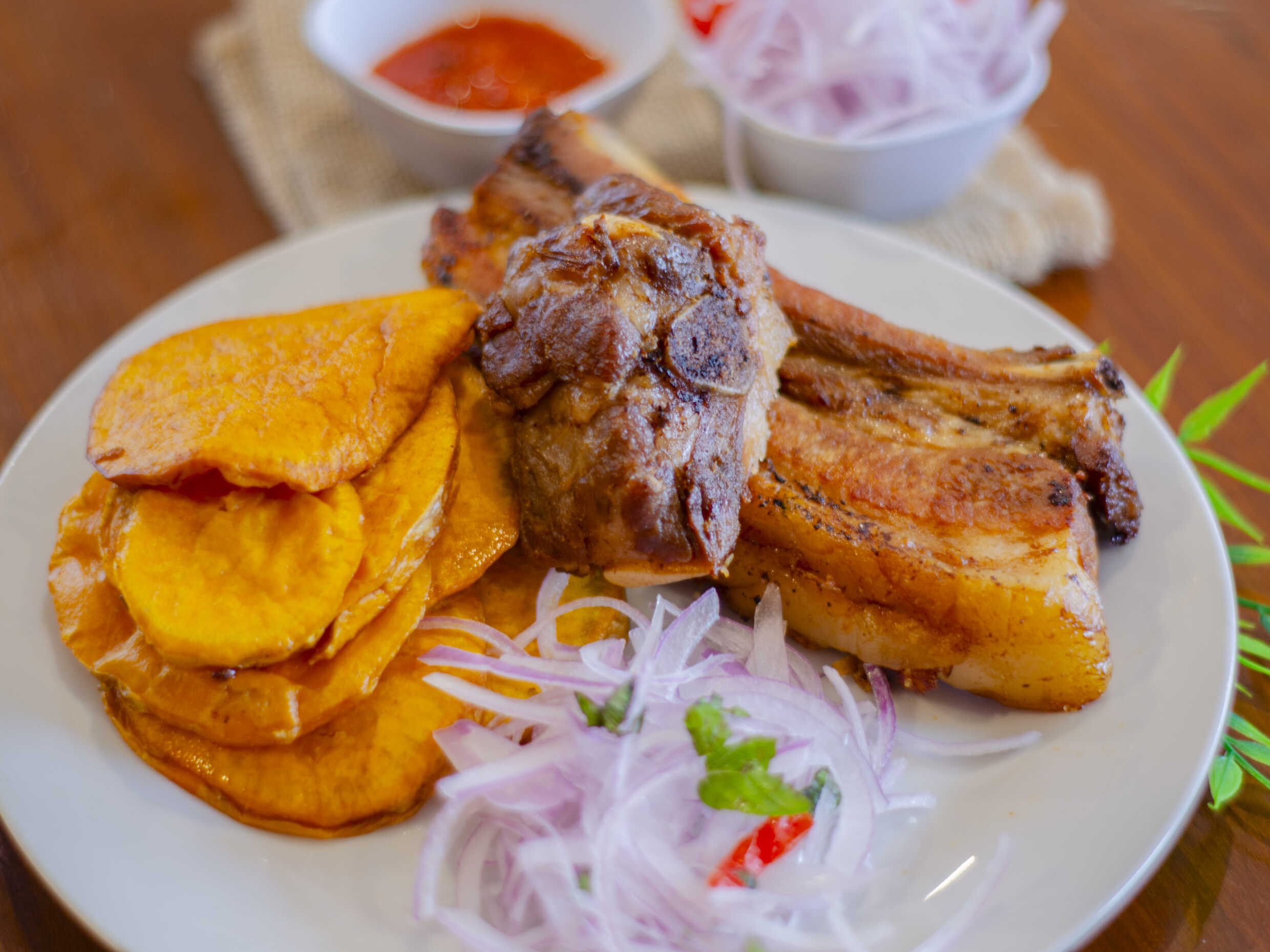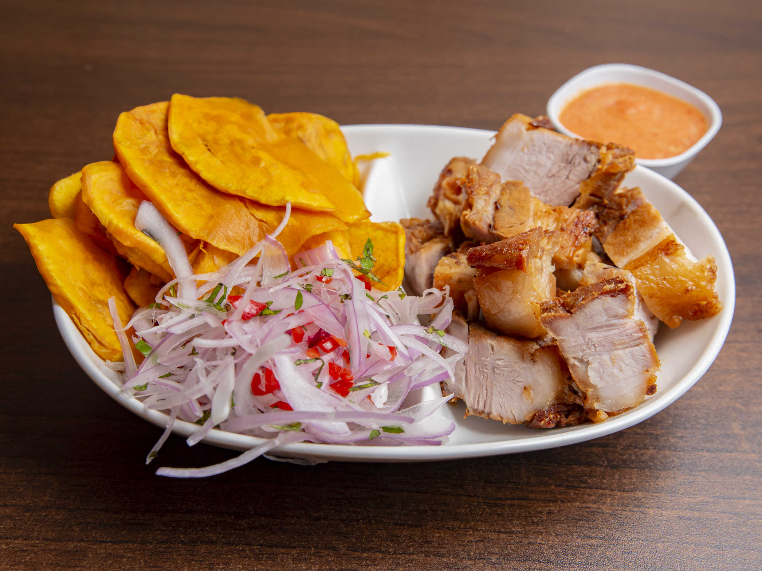 1 kg De chicharrón, porción de camote y sarza de cebolla.