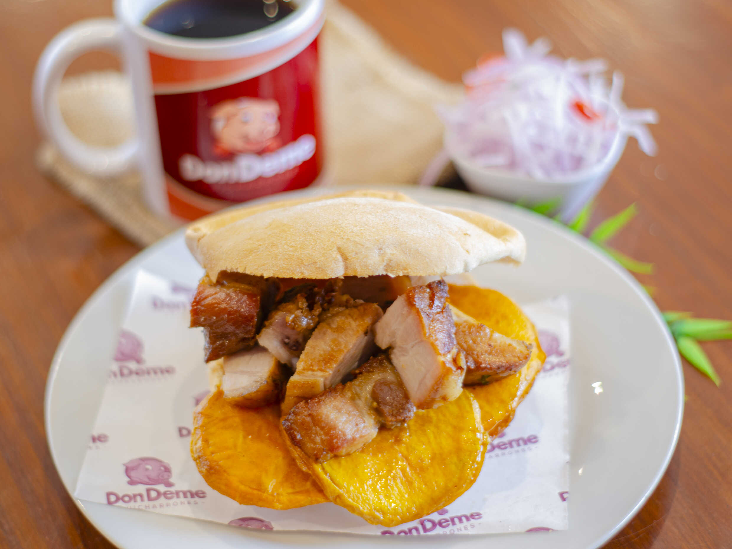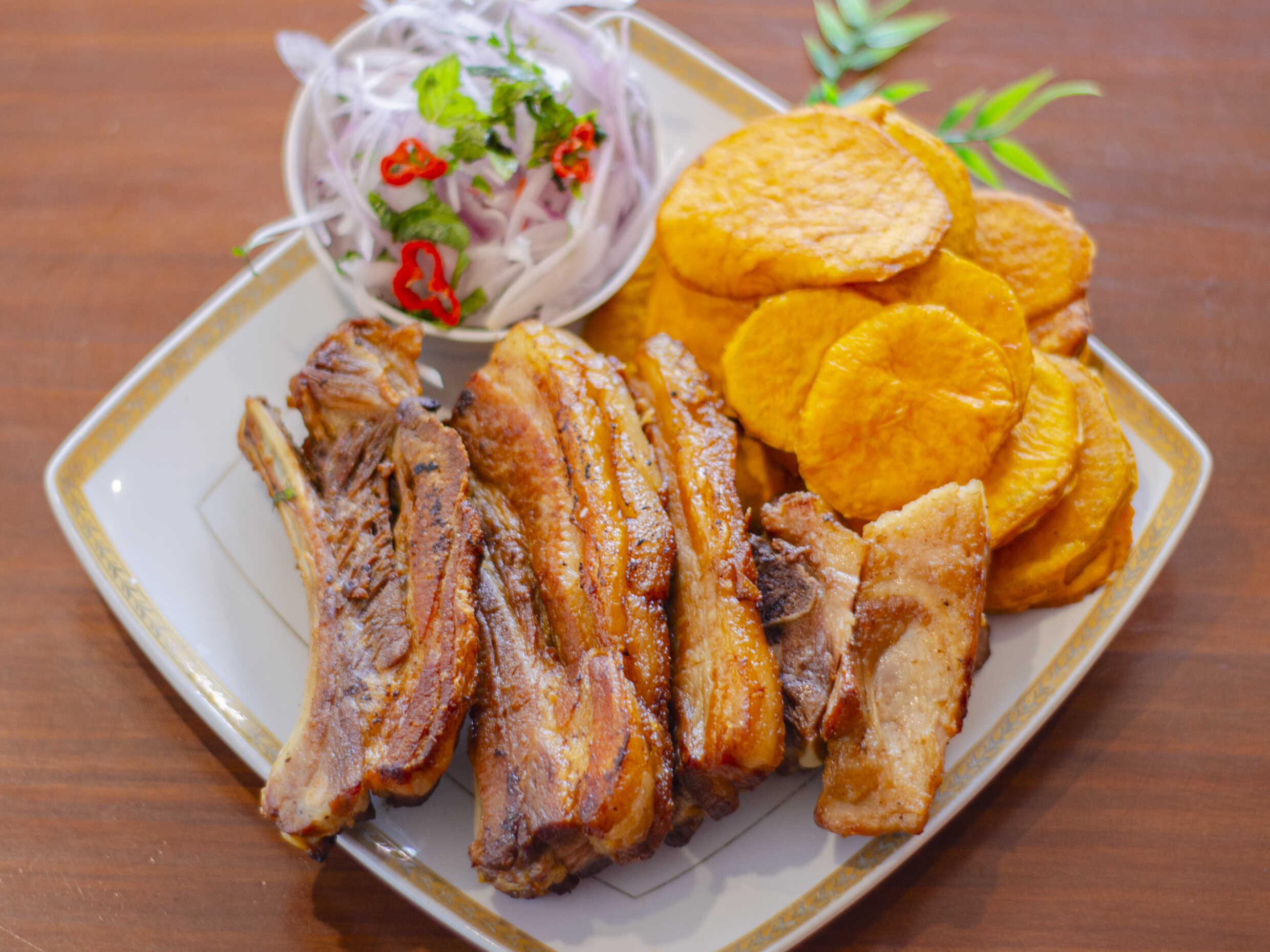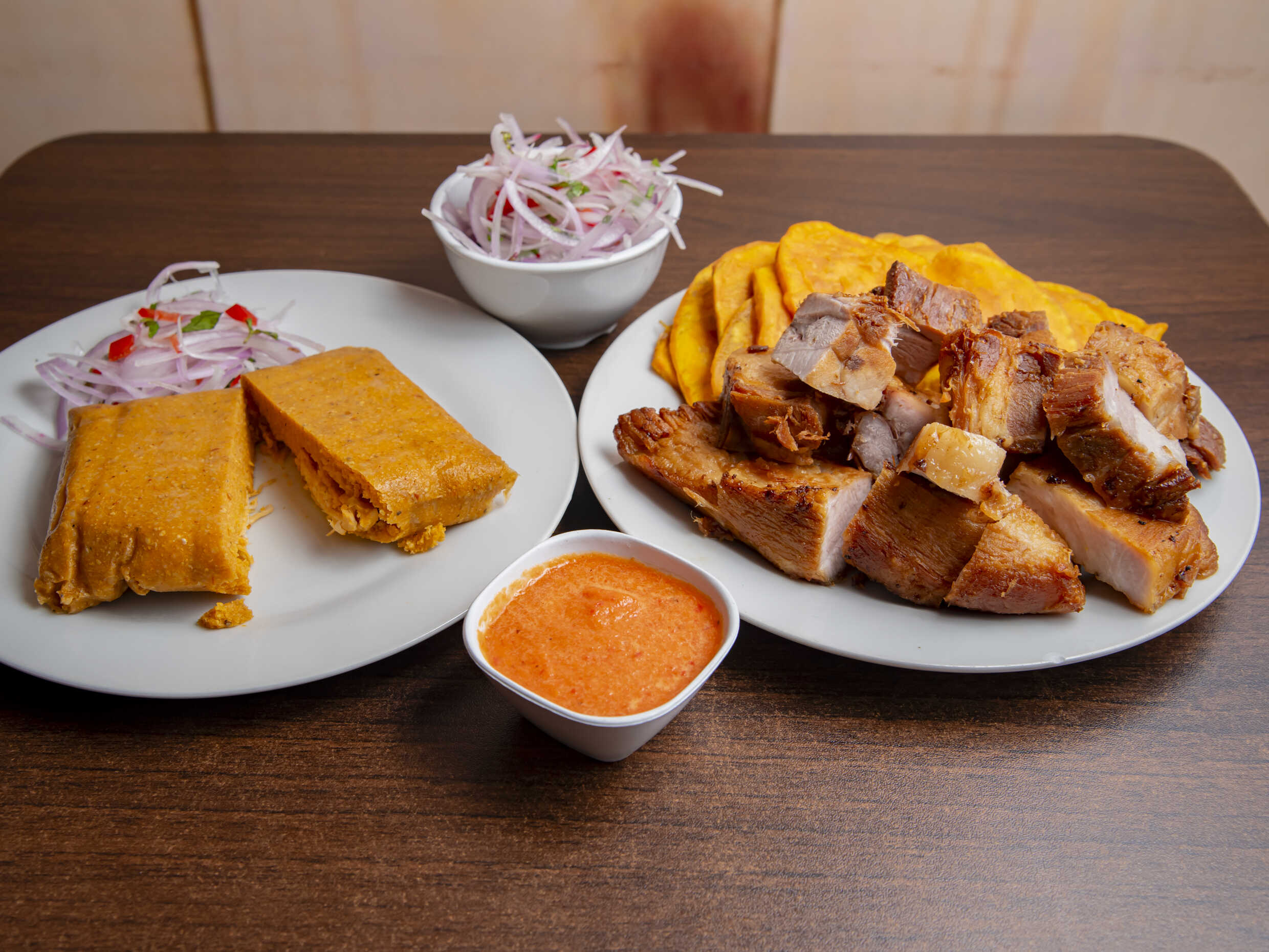 1/4 kg De chicharrón, porción de camote, tamal de pollo o chancho y sarza de cebolla.