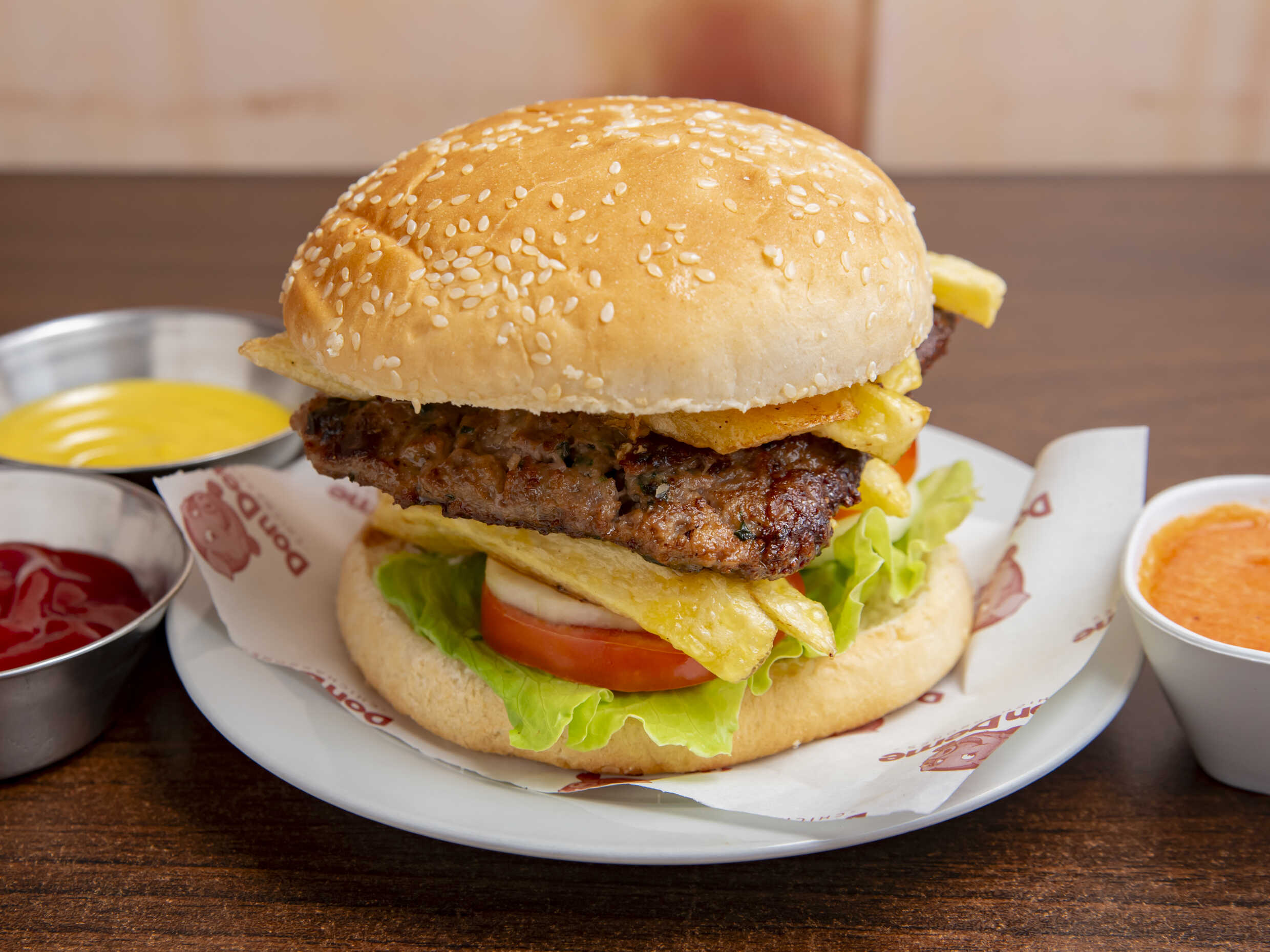 Carne artesanal + Queso + Tocino + Huevo + Papas Fritas