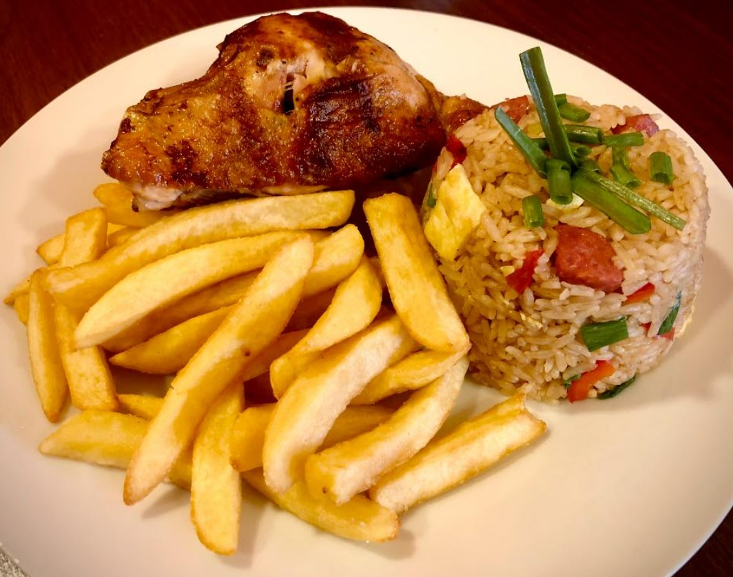 1/4 de pollo a la brasa, acompañado de papas fritas, arroz chaufa, ensalada fresca y nuestras cremas.
