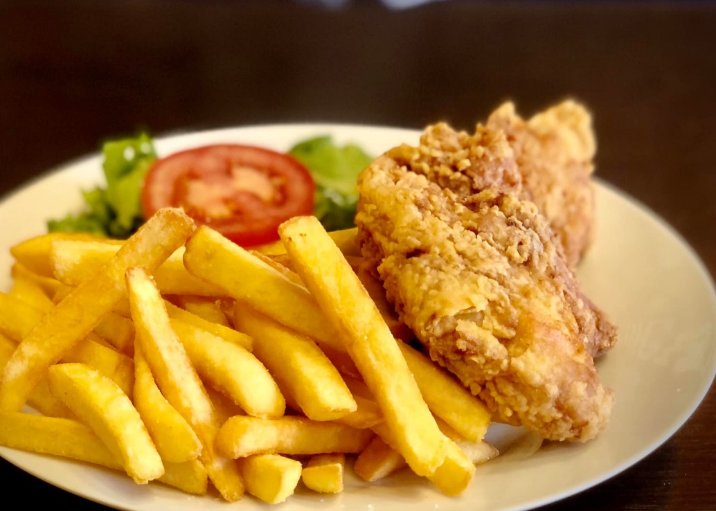 1/8 de pollo broaster servido con papas fritas, ensalada y nuestras cremas