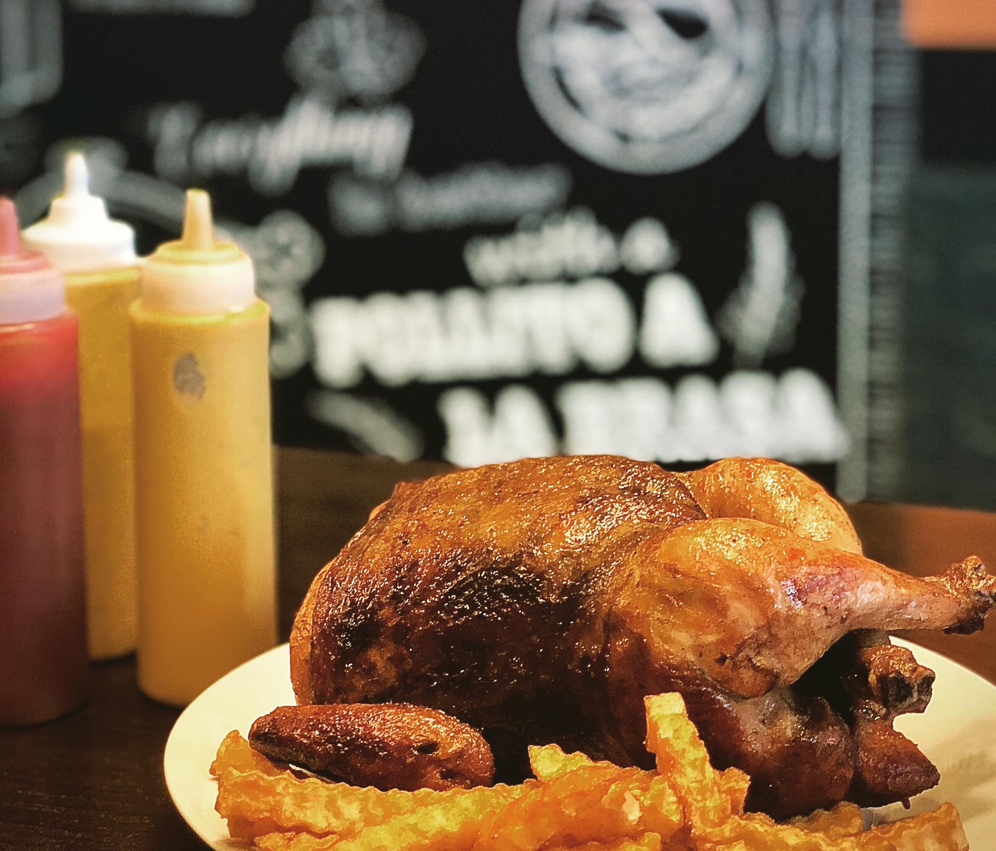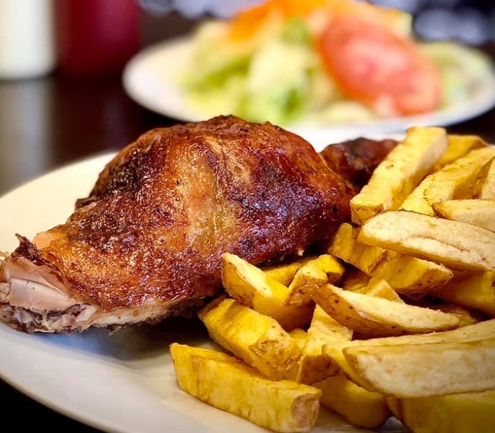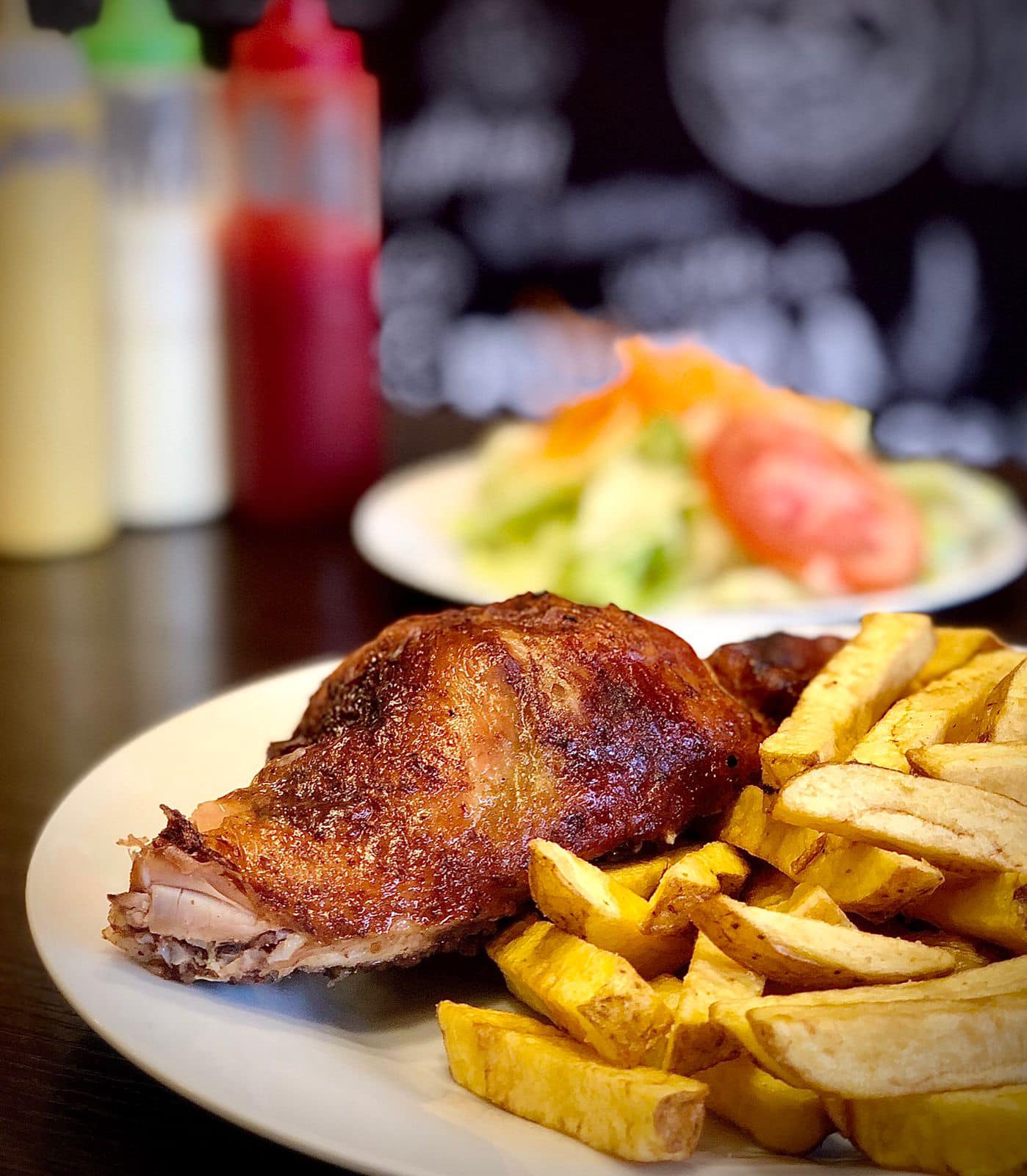 Pollo a la brasa acompañado de papas fritas, ensalada fresca, aji pollero, mayonesa, ketchup y mostaza.