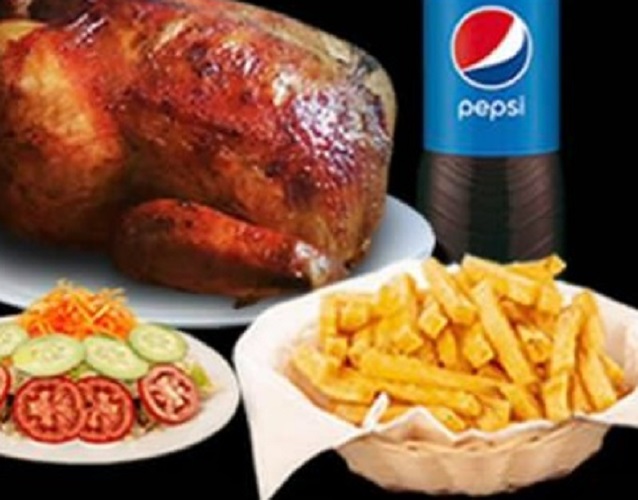 1 pollo, papas, ensalada, gaseosa de 1.5 L (Pepsi o Seven Up) y cremas.