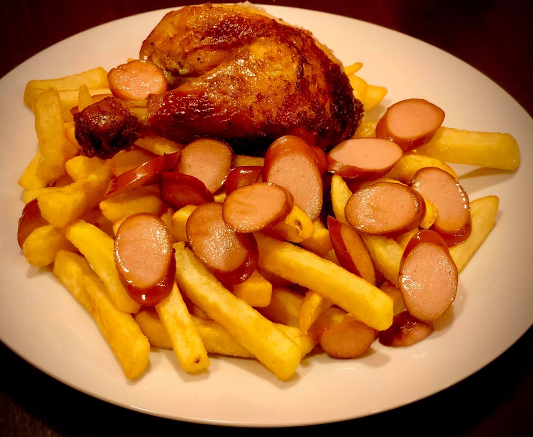 Salchipapa y 1/8 de pollo a la brasa, con mayonesa, aji, ketchup y mostaza.