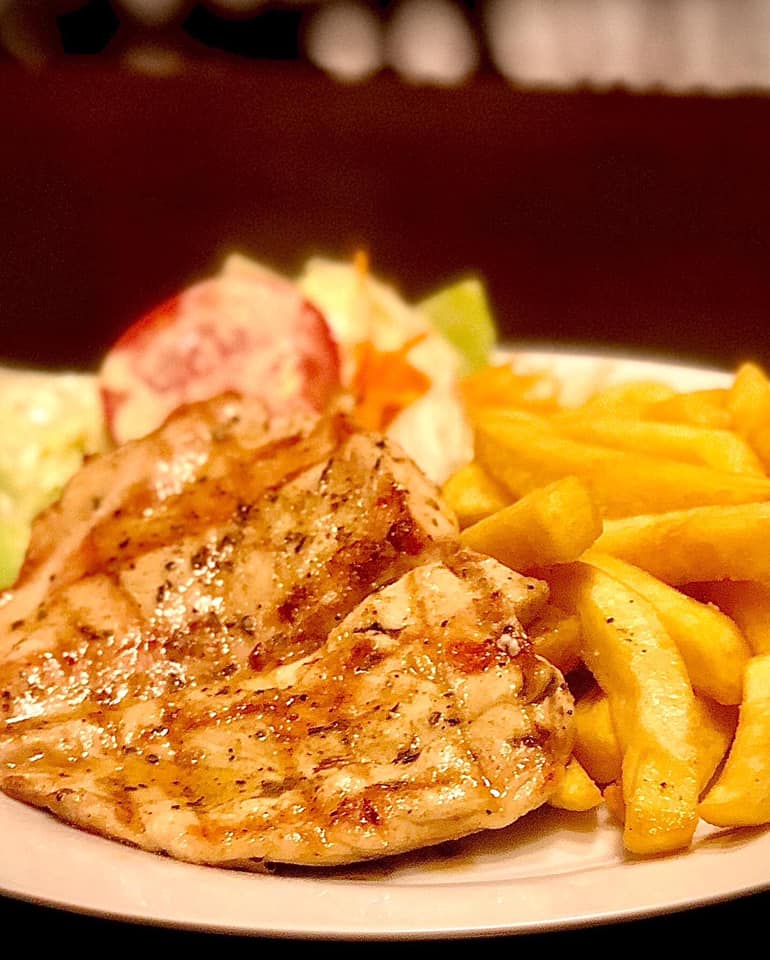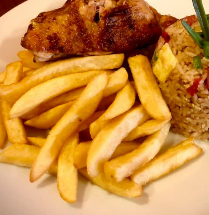 1/2 pollo a la brasa acompañado con papas fritas y ensalada fresca, aji pollero, mayonesa, ketchup y mostaza.