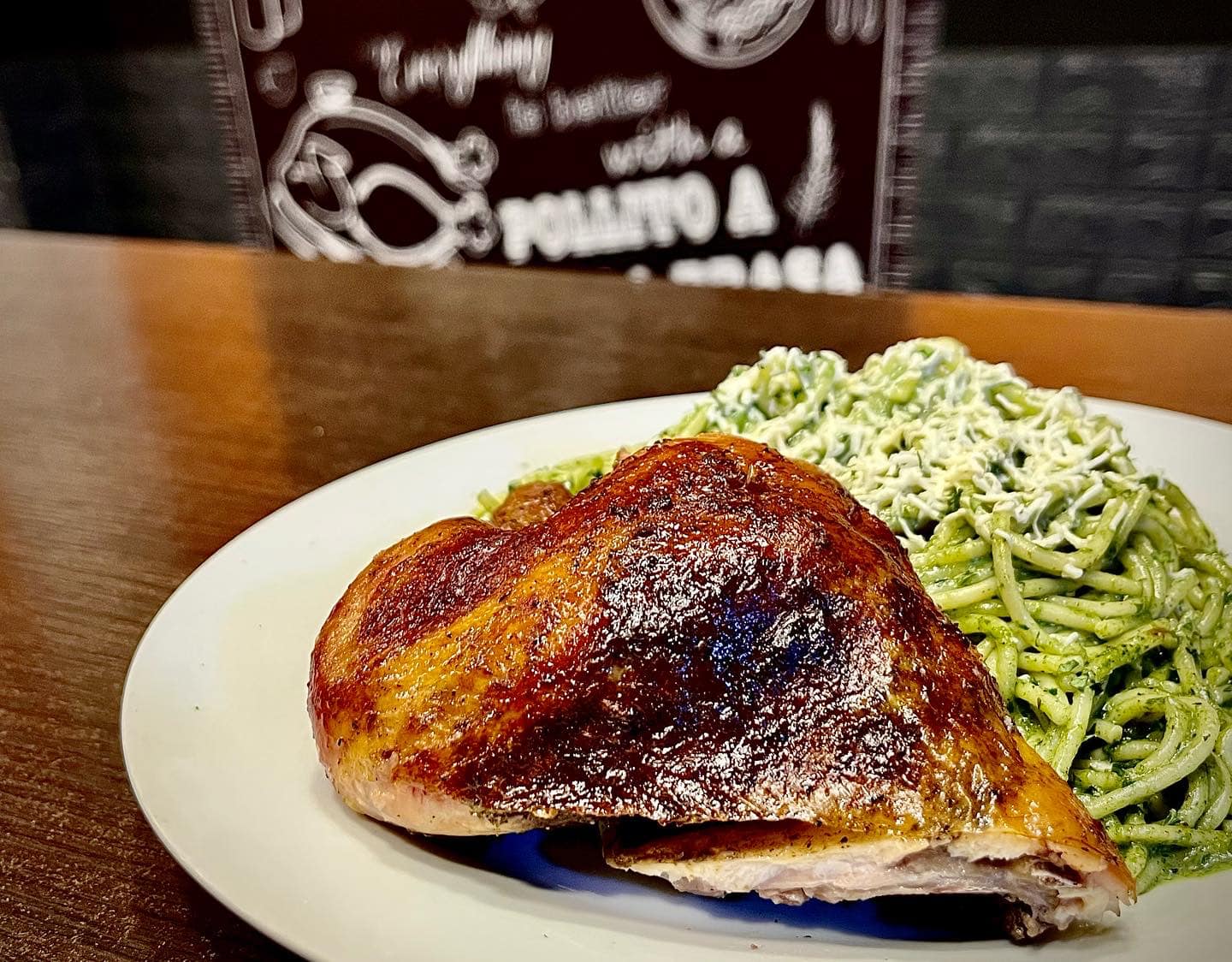Tallarin verde servido con cuarto de pollo a la brasa.