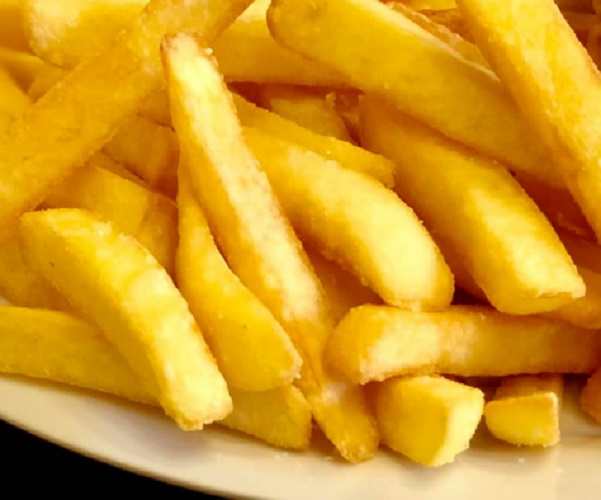 Saltado de pollo servido con arroz blanco y papas fritas.