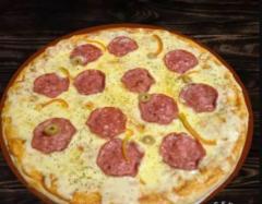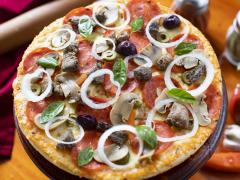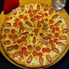 Mozzarella, carne, pepperoni, champiñón, cebolla blanca y albahaca.