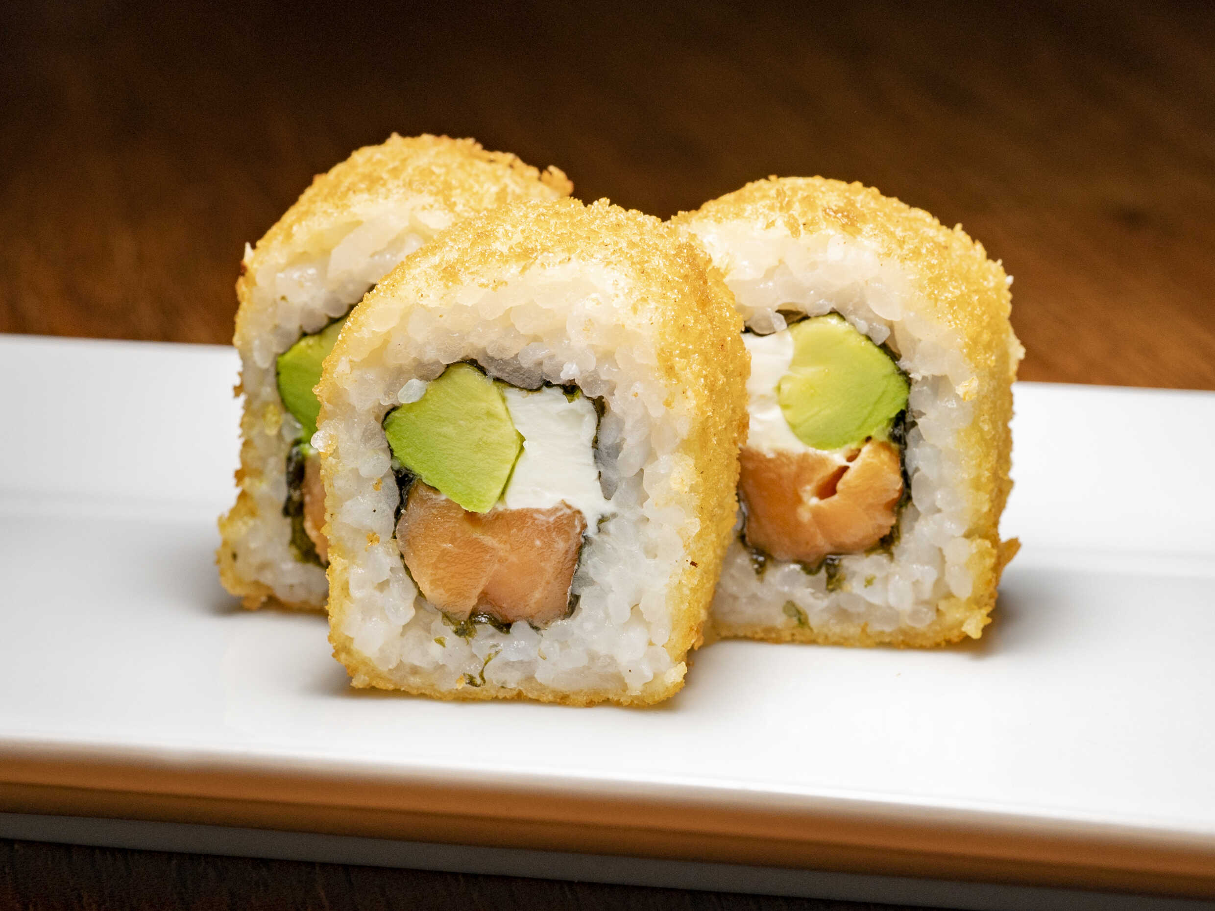 Relleno de pescado furai, queso crema y palta, frito al panko coronado con salsa acevichada.