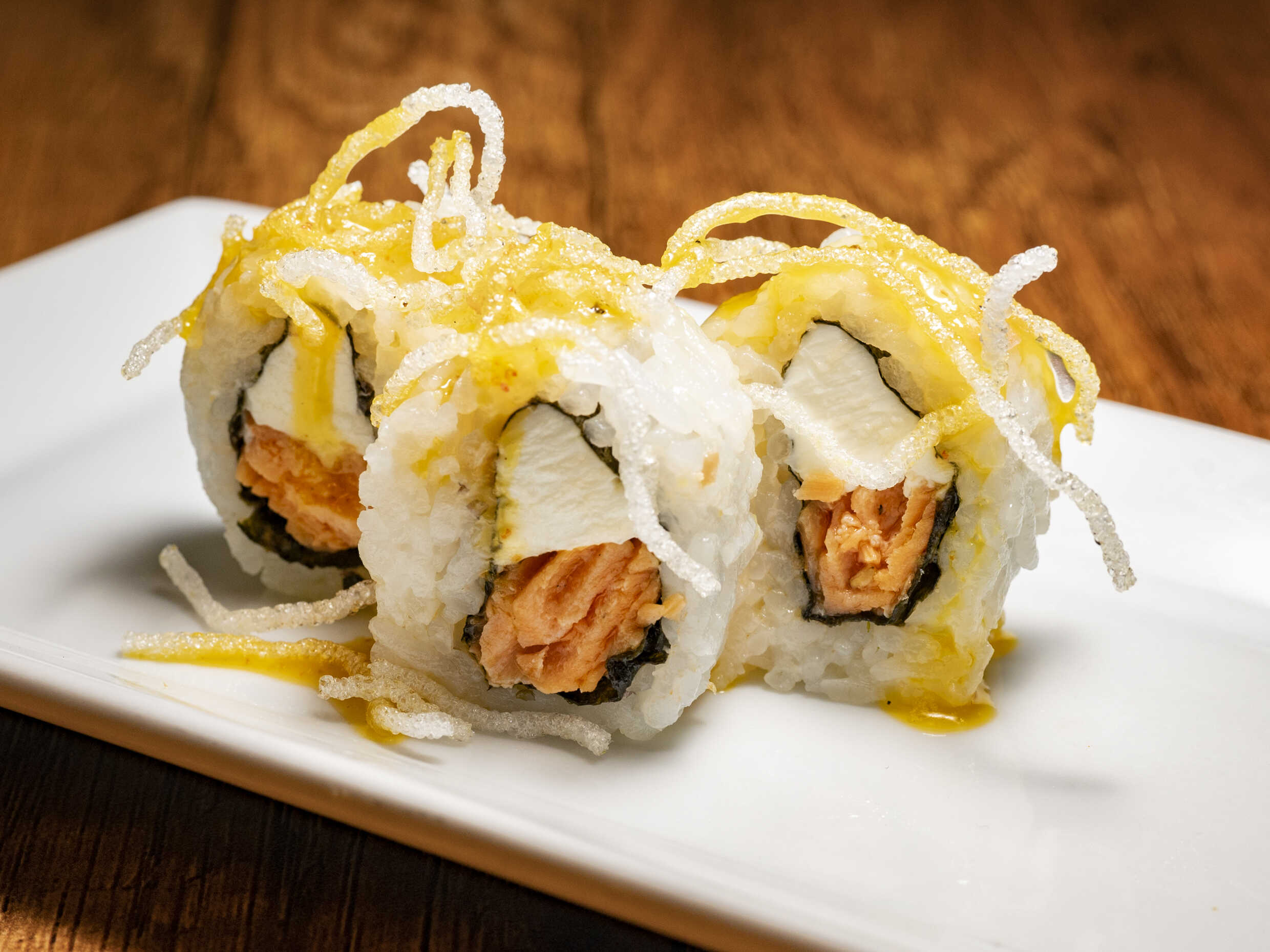 Relleno de Trucha Salmoneada, palta y queso crema, cubierto por nuestro tartar de Salmón con un toque picante encima.
