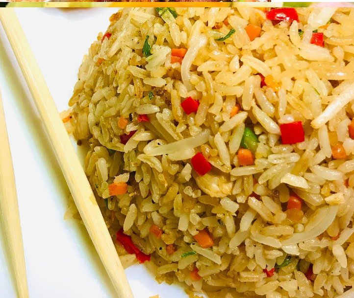 Arroz frito al estilo japonés con pollo y verduras acompañado de chicken katsu.