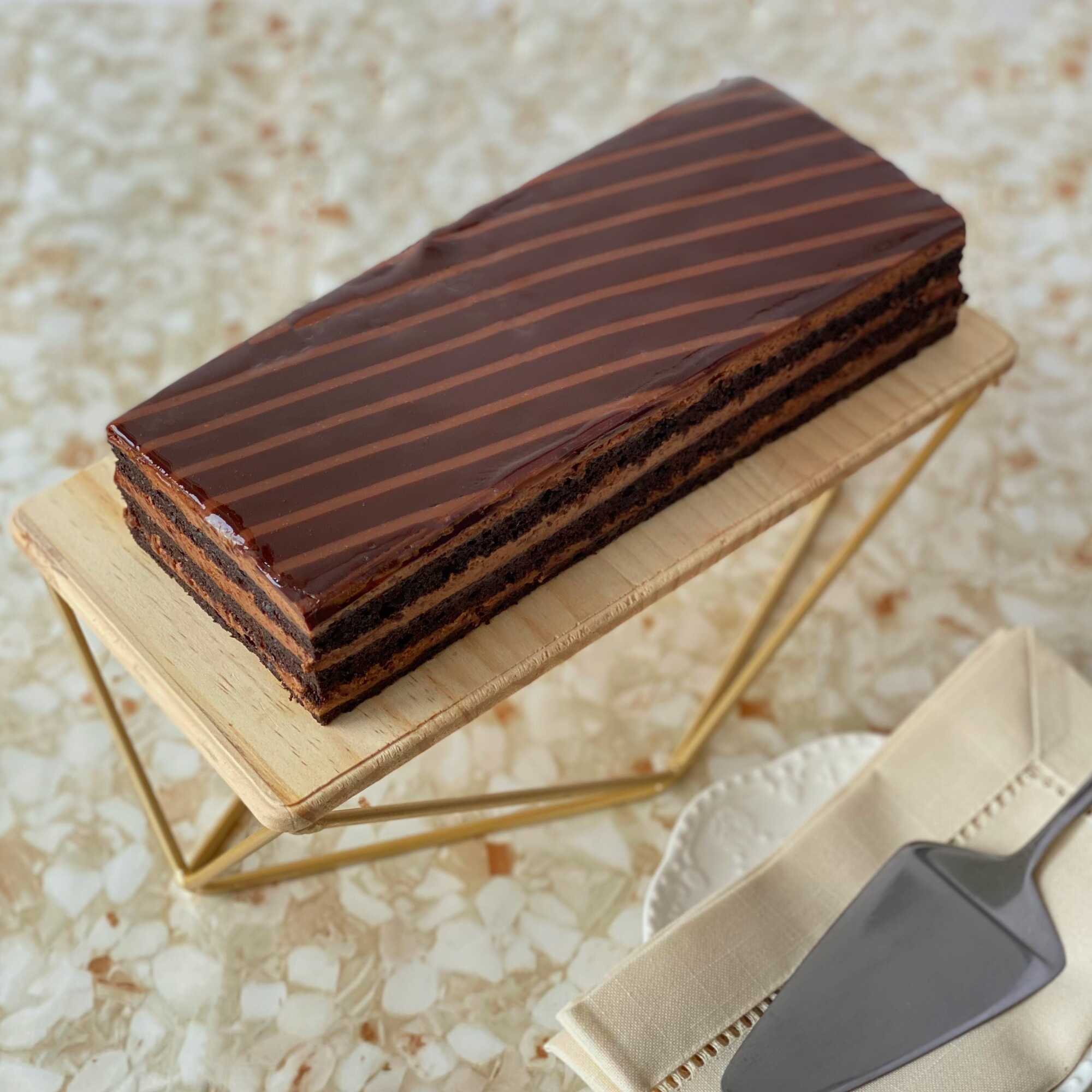 keke de chocolate relleno de trufa crocante y cubierta de ganache (crema de chocolate).