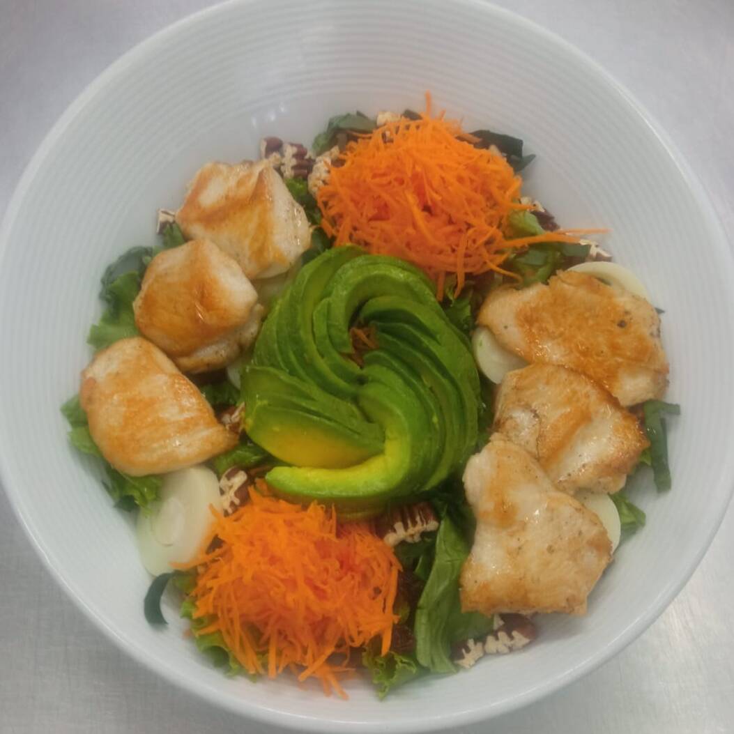 Fettuccini, salsa pesto, parmesano y pavo crispy.