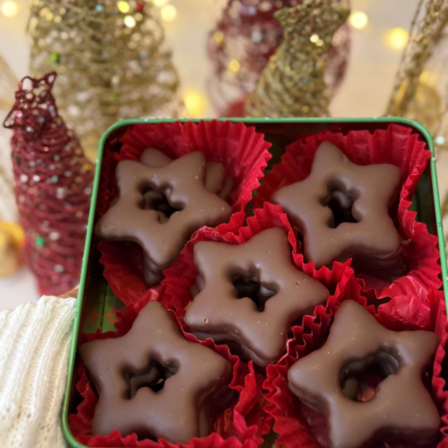 Lata navideña que contiene 20 unidades de galletas de chocolate.