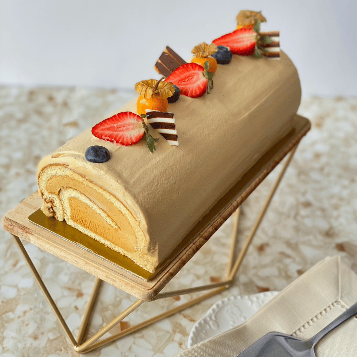 Hecho con masa de harina, azúcar, huevo y mantequilla, y relleno con crema de avellanas y crema pastelera. Decorado con almendras, cranberries y ralladura de naranja.