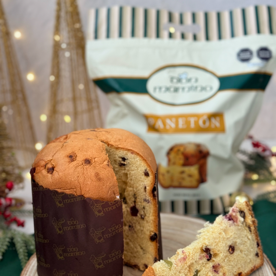 Panetón tradicional con pasas y frutas confitadas en presentación de 900 gramos.
