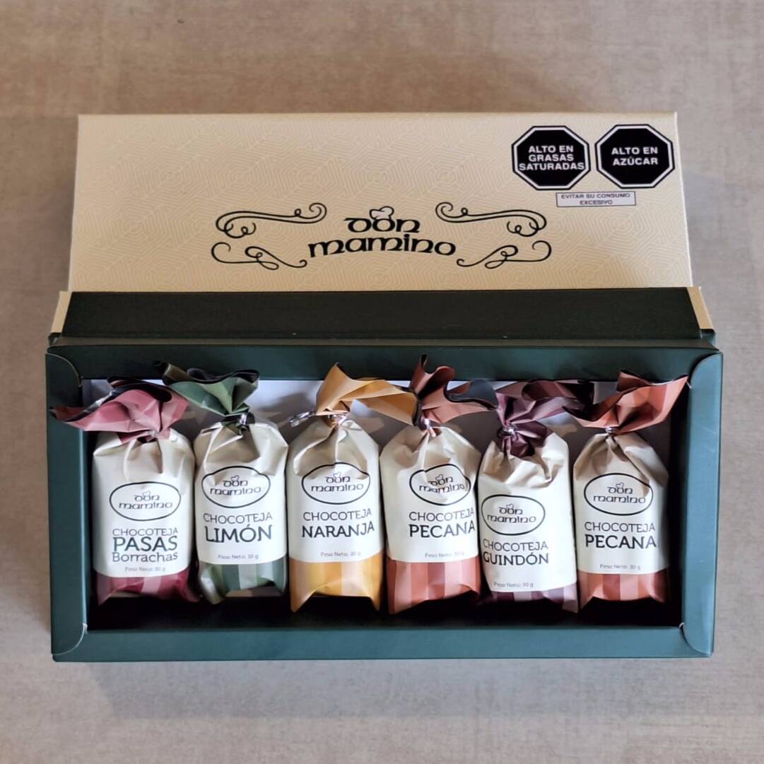 Chocotejas de sabores surtidos (pecanas, limón, naranja, guindón y pasas borrachas). Caja de 6 unidades.
