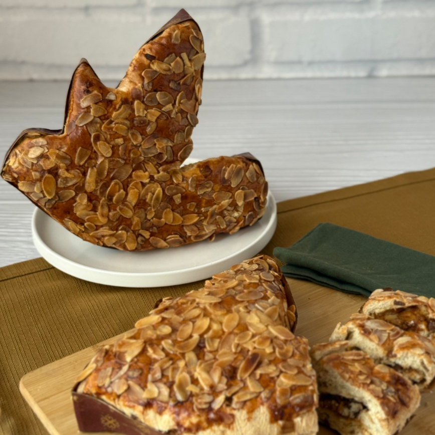Pan especial elaborado con masa brioche, relleno de manjar blanco, naranja confitada y almendras, cubierto con almendras laminadas.