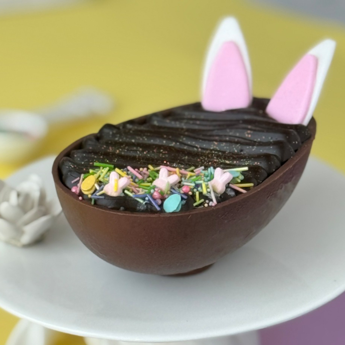 Base de chocolate en forma de huevo, relleno con keke de chocolate y fudge, decorado con orejitas de conejo y grageas.
