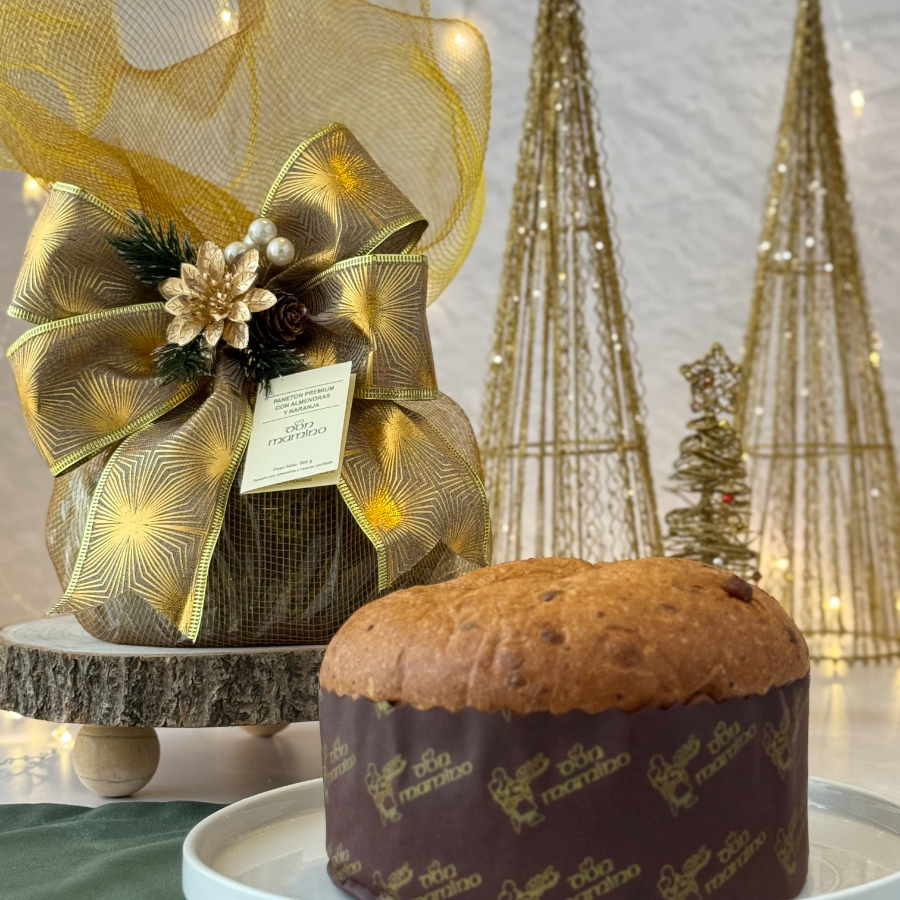 Panetón premium elaborado con almendras y naranjas confitadas.