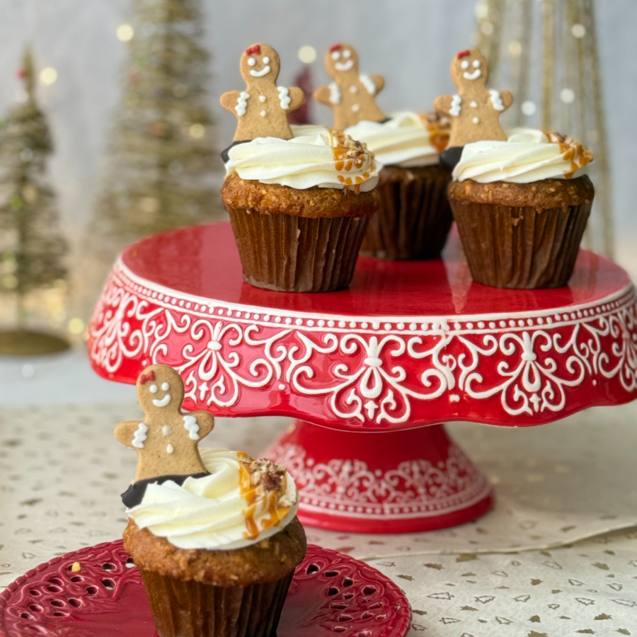 Cupcake de zanahoria relleno con un toque de frosting de queso crema, decorado con butterscotch y galleta de jengibre. Presentación en caja de 3 unidades.